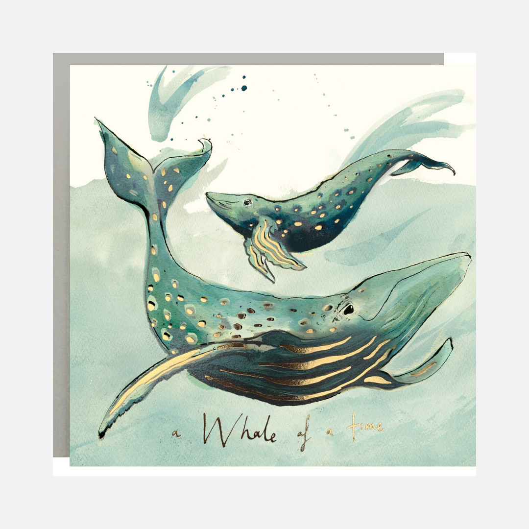 Send big smiles with this delightful gold foil embossed greetings card by Anna Wright, featuring two huge, happy whales and the playful handwritten message ‘a Whale of a time’.