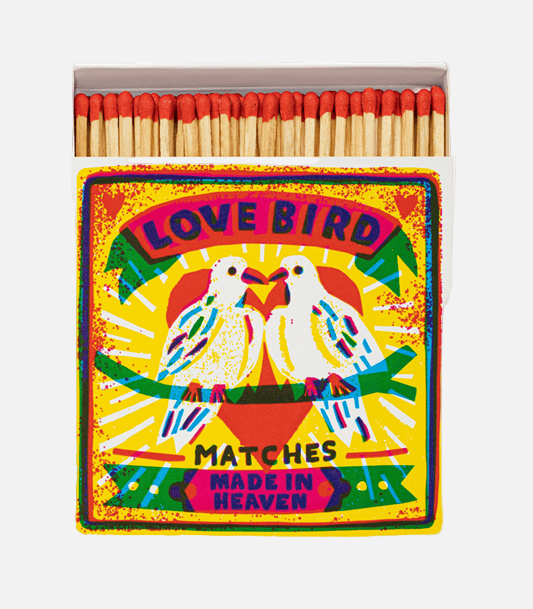 Bursting with colour and charm, this square matchbox by Archivist Gallery features a vibrant Love Birds illustration. Two bright, beak-to-beak birds perched together in a flurry of sunshine tones and retro-inspired detailing. Joyful, bold and unmistakably romantic, it’s a design that brings instant cheer. Filled with extra-long matches, it’s practical too, making it a delightful little gift for anniversaries, weddings or anyone who appreciates a splash of fun.