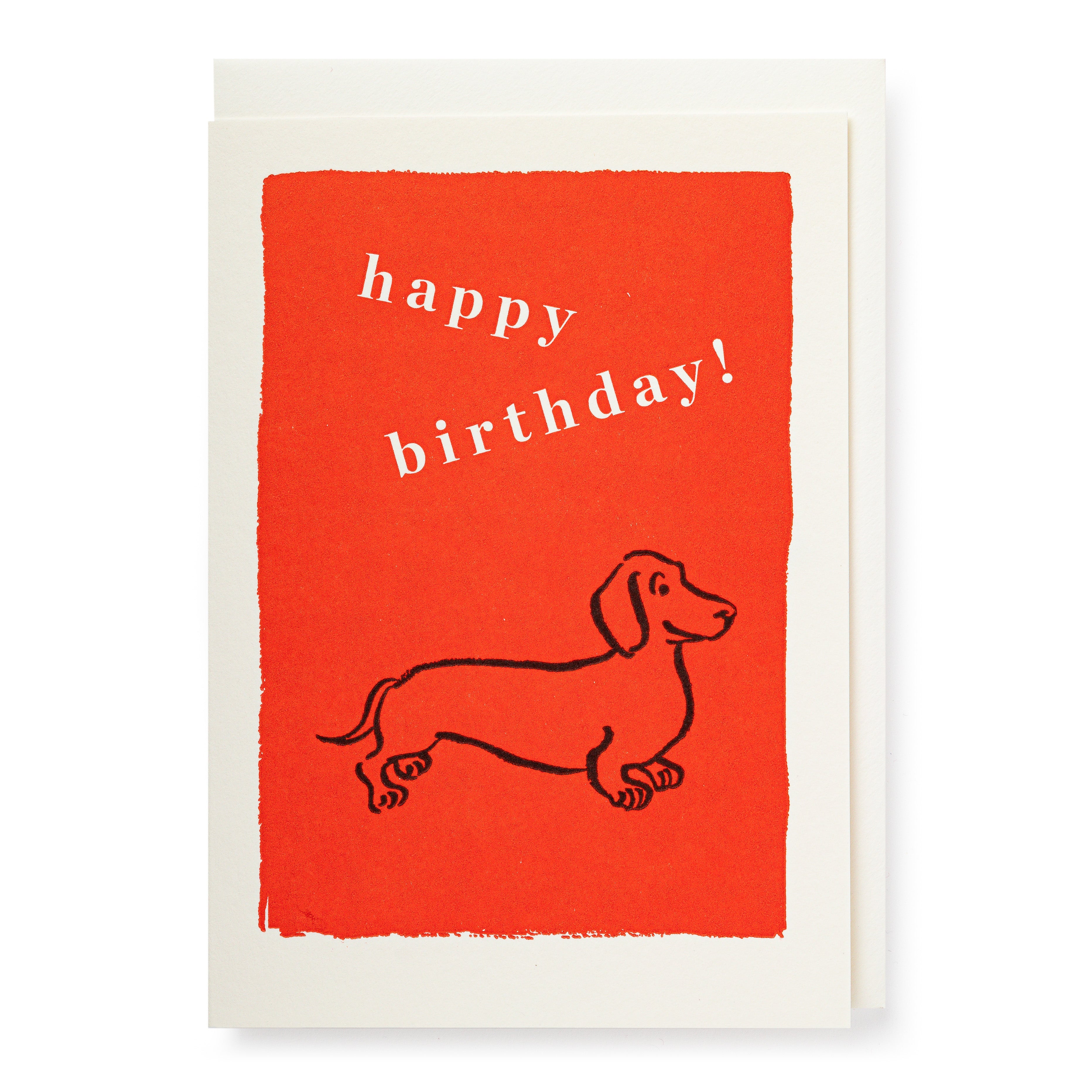 "Happy Birthday" Hot diggedy dog! Another birthday to celebrate! What better way to wish them congratulations (and celebrations) than with England's fifth favourite four legged friend, the dachshund of course. Featuring the majestic miniature pooch against bright red ink, J.Falkner's sausage dog card for Archivist Gallery is sure to bring a smile to any dog lover's face on their special day.