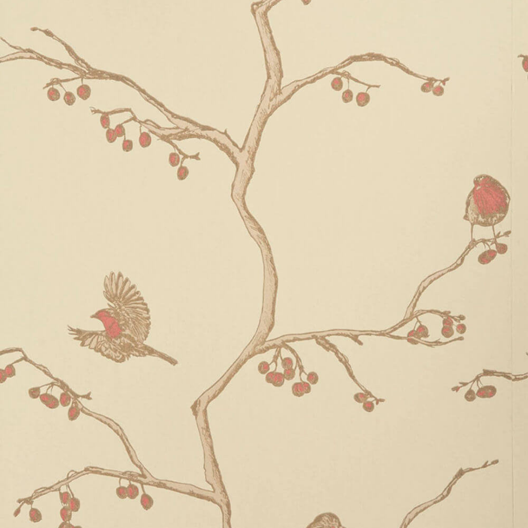 The stunning English Robin design from Barneby Gates is their take on the quintessentially English bird is prettily pink breasted and flitting between softly metallicised branches. This wallpaper is available in 2 gorgeous colourways.