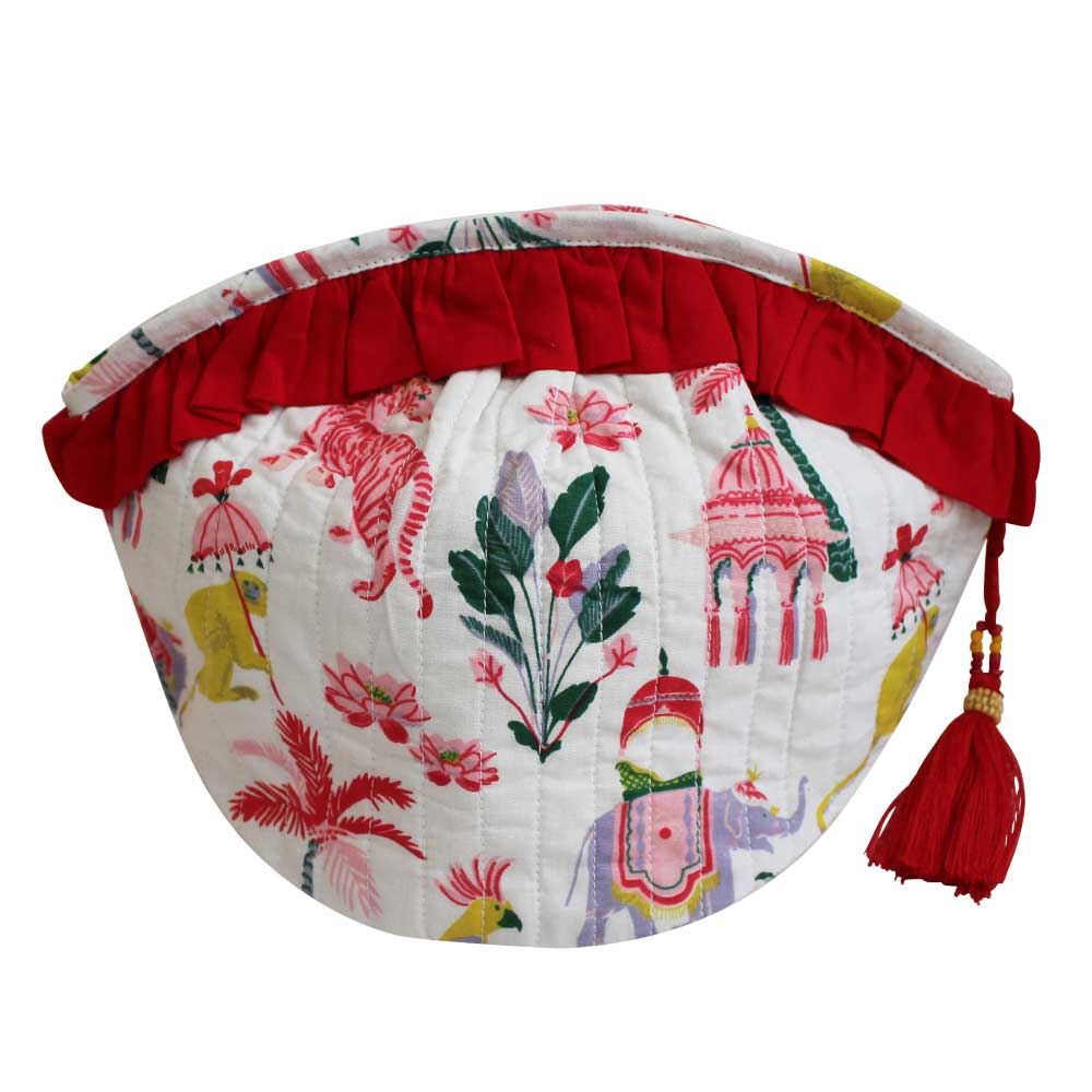 Experience the exotic elegance of Powell Craft's Sultan’s Garden print. This playful design features majestic tigers, majestic elephants, mischievous monkeys, and colorful cockatoos surrounded by lush palms, intricate pagodas, and delicate lotus flowers. This quilted cotton wash bag is roomy enough to store essential products for holidays and so beautiful you’ll want to keep it on display in the bathroom! The rounded ‘balloon’ shaped bag has a silky lining with a zipped internal pocket. The print is complimented with a red frill and matching tassel zip pull.