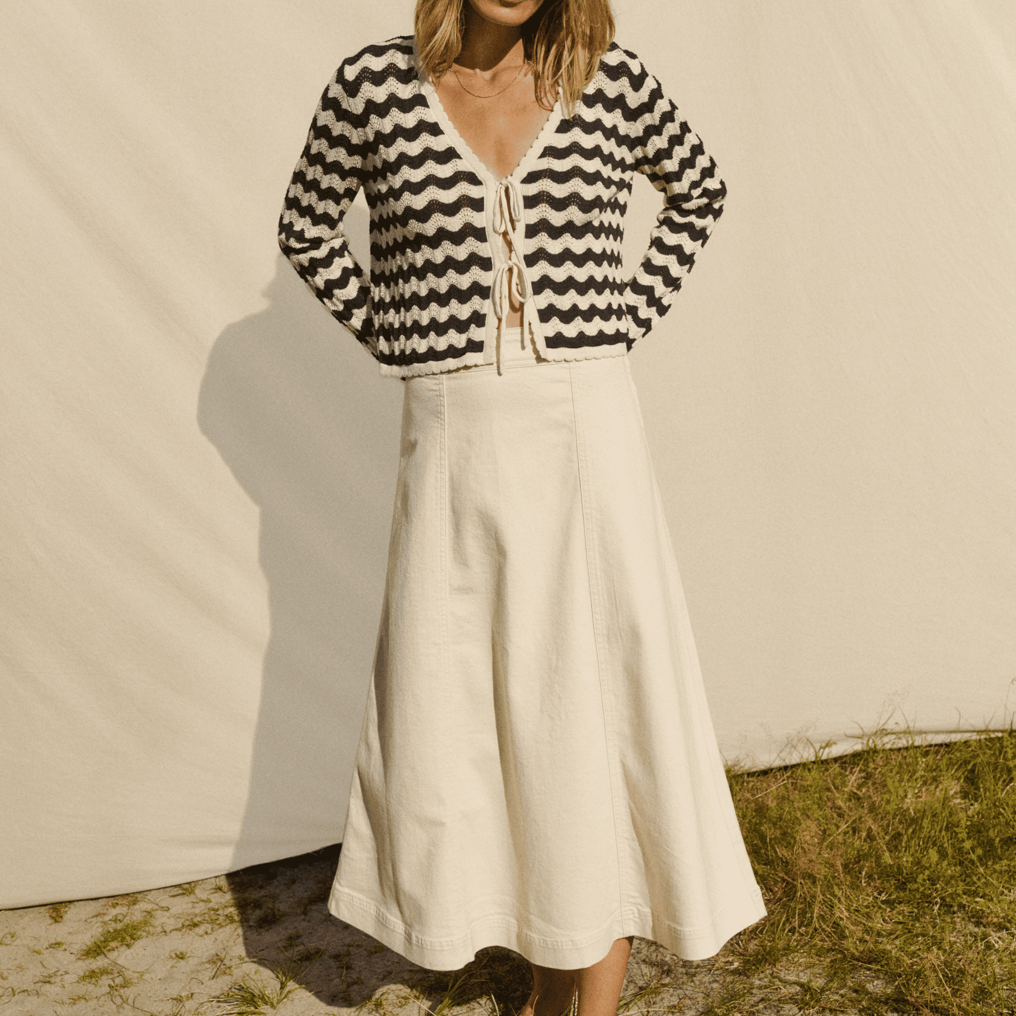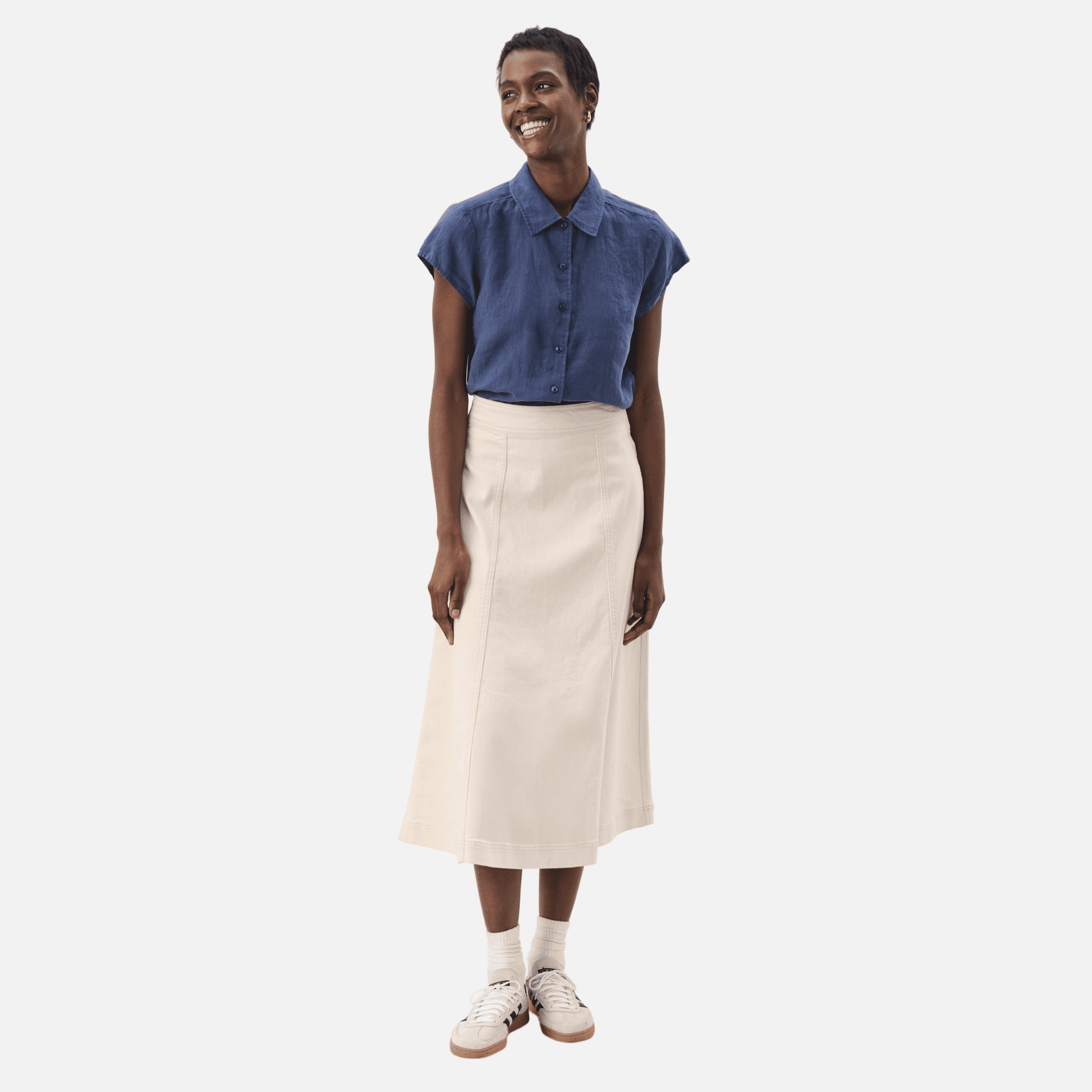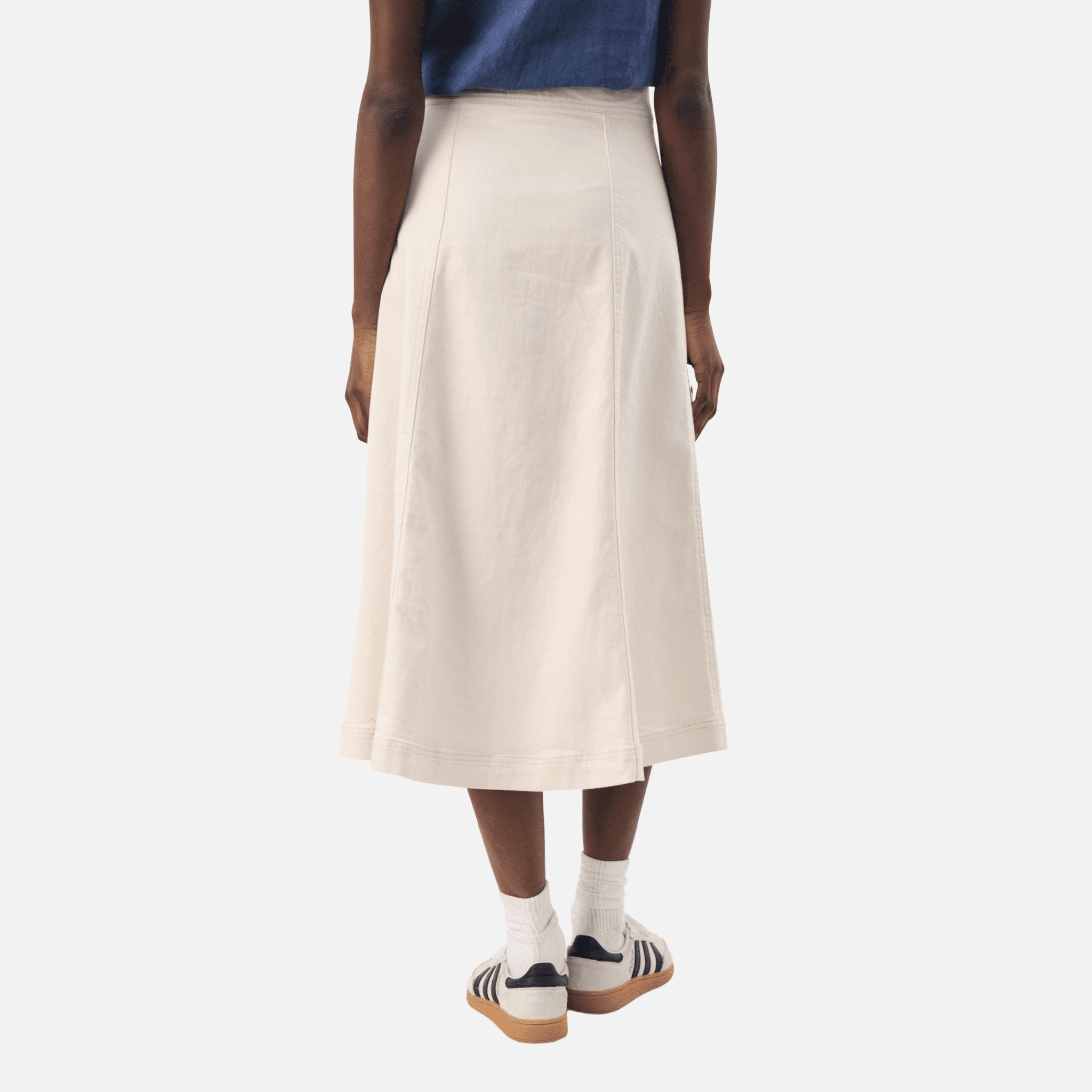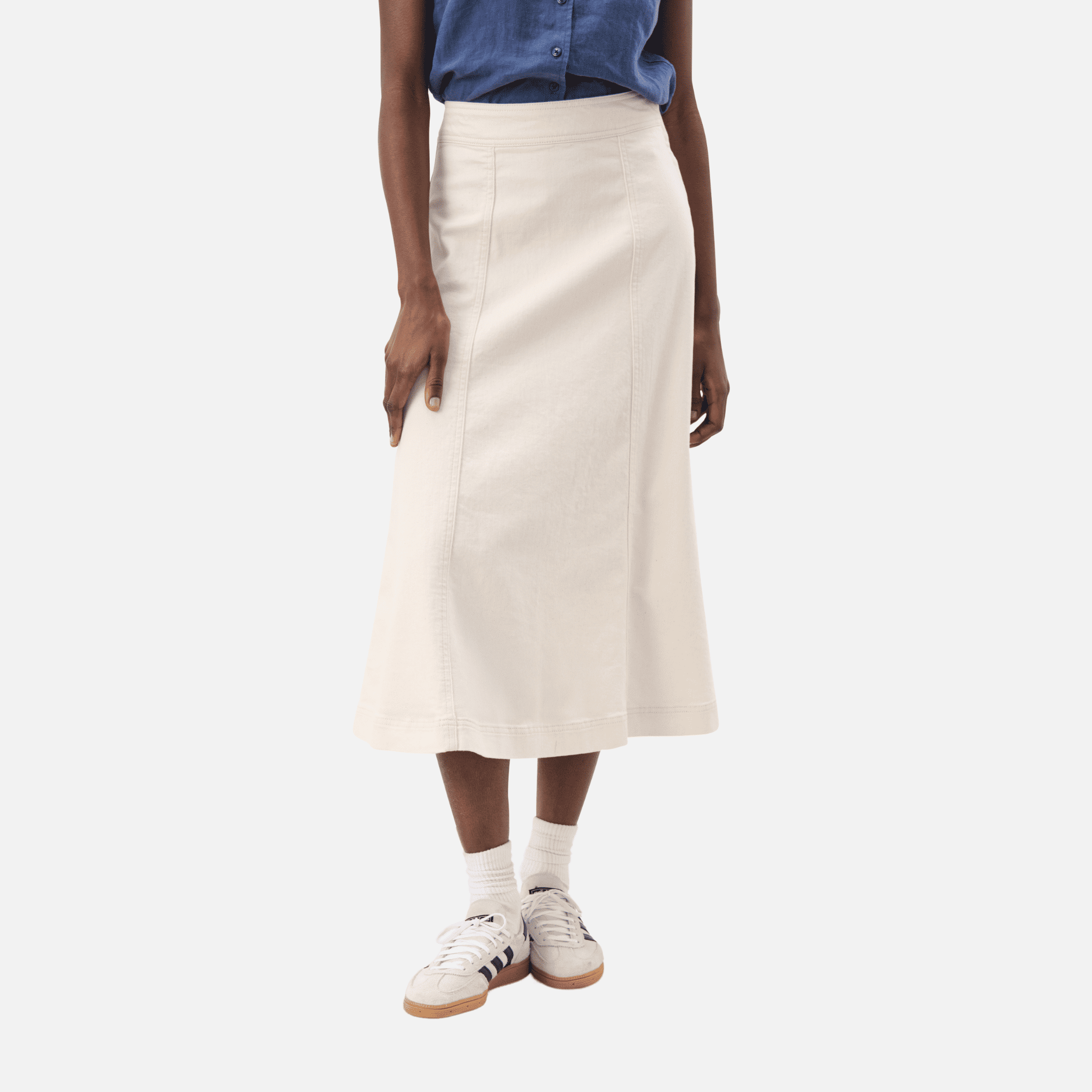 This elegant A-line midi skirt is crafted from a soft, lightweight cotton blend with just a hint of stretch for added comfort. Designed to flatter with a high waist and subtle seam detailing, it drapes beautifully for a timeless, feminine silhouette.