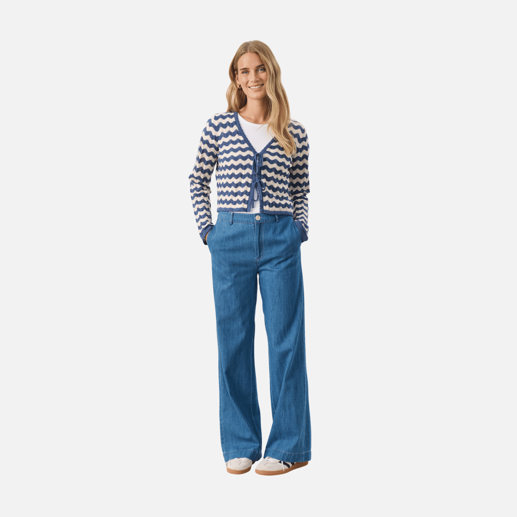 Add a touch of texture to your spring/summer wardrobe with the Rosefine Striped Cardigan by Part Two. Crafted from 100% organic cotton, this beautifully knitted cardigan features a decorative wavy pointelle pattern that offers an airy, lightweight feel. The soft stripe design in Whitecap Cream and Oceana Blue adds a fresh, coastal-inspired vibe, while the full-length sleeves and tie front relaxed fit ensure comfort and ease.