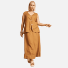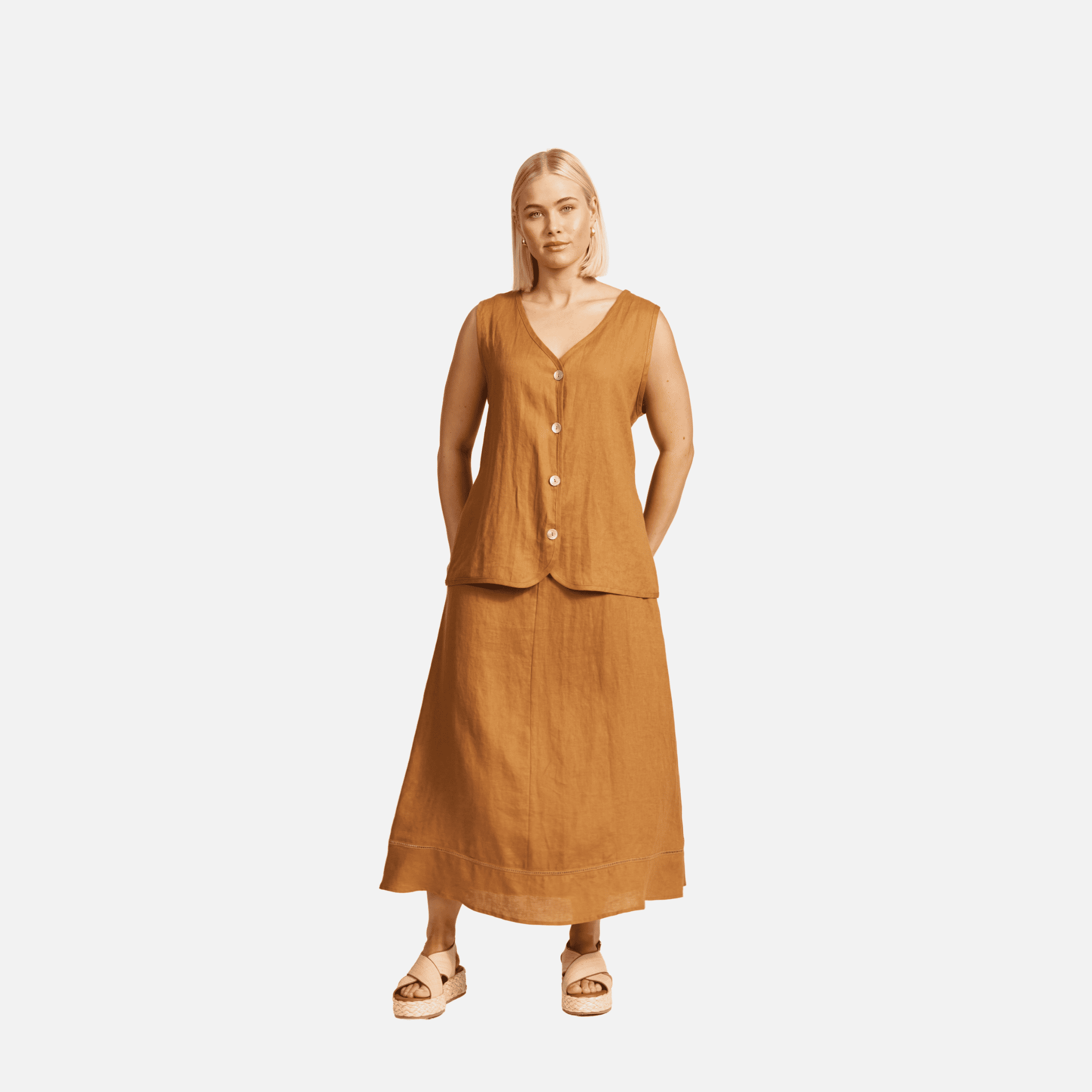 Effortlessly refined with a relaxed, modern edge, the Miramar Linen Vest in Caramel by Eb & Ive is a versatile layering piece designed for warm-weather ease. Crafted from 100% linen, it offers breathable comfort with a naturally textured finish, while the clean, sleeveless silhouette and button-front detail create a look that is both polished and understated.