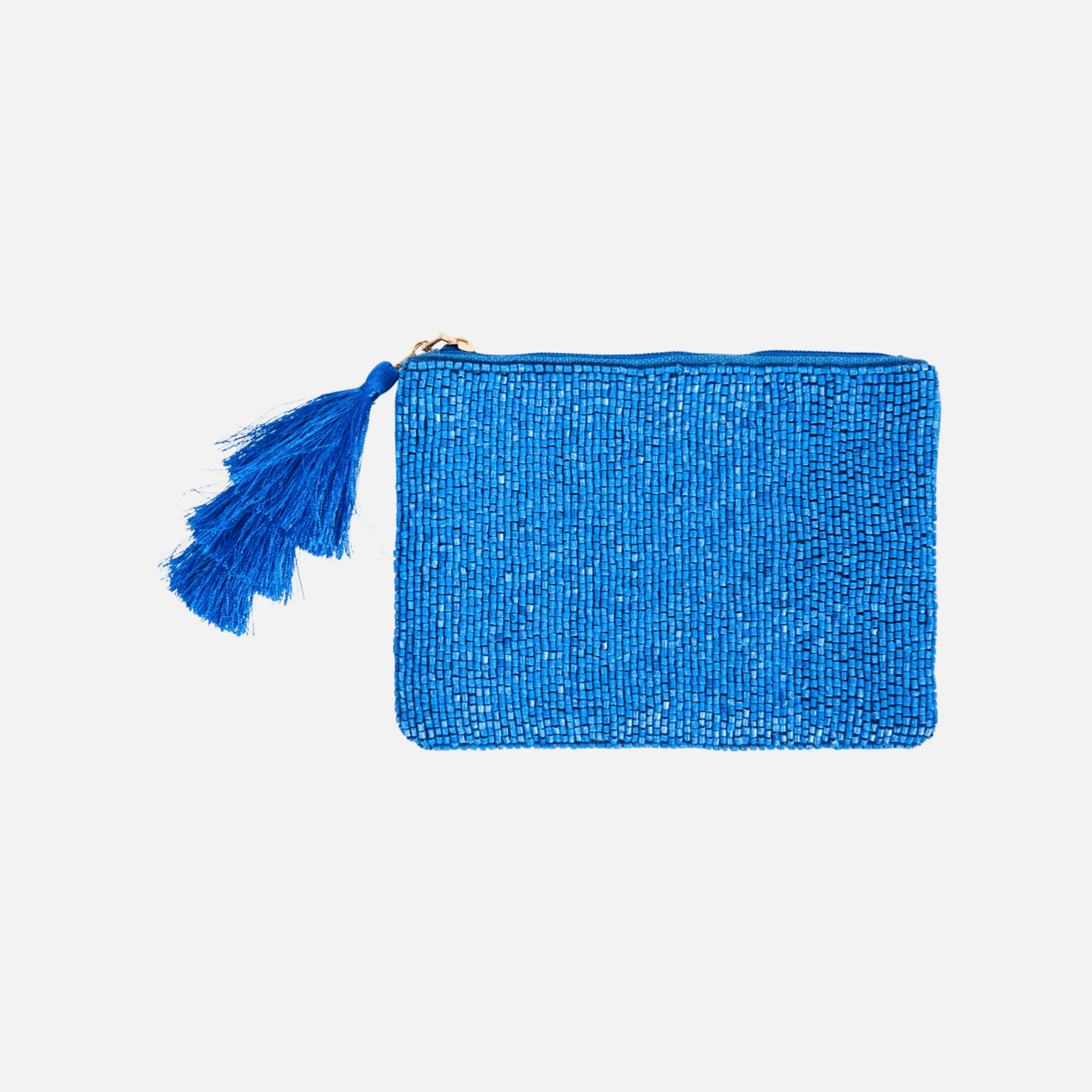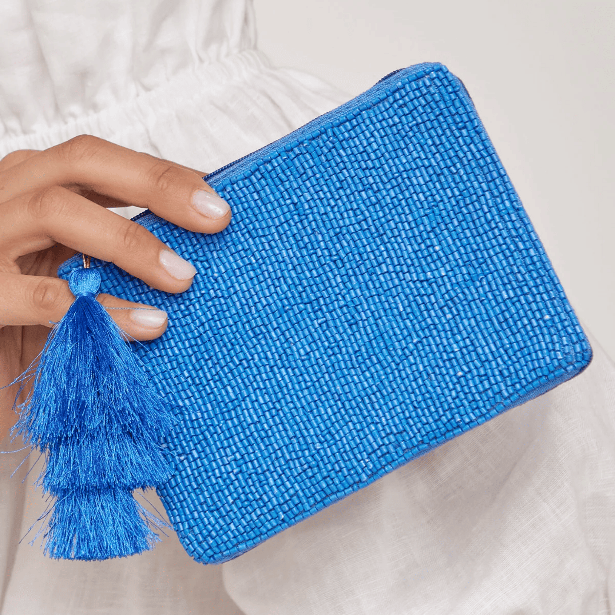 Add a playful pop of colour to your accessories with the Playa Pouch in Cobalt Blue by Eb & Ive. This compact pouch features an intricate hand-beaded design in fresh green tones, complete with a statement tassel zipper for a touch of boho charm. Perfect for carrying your essentials to dinner, events, or beachside strolls.