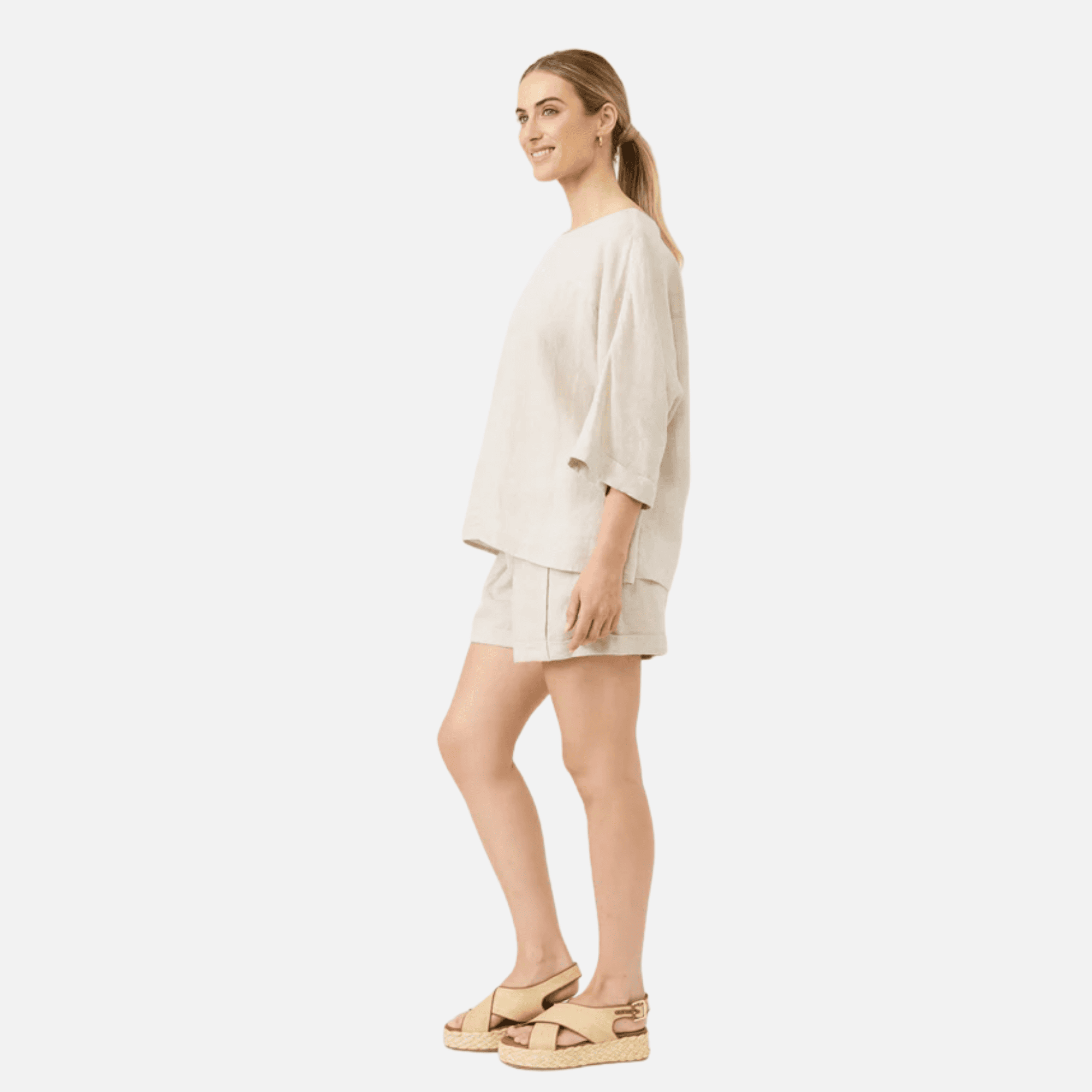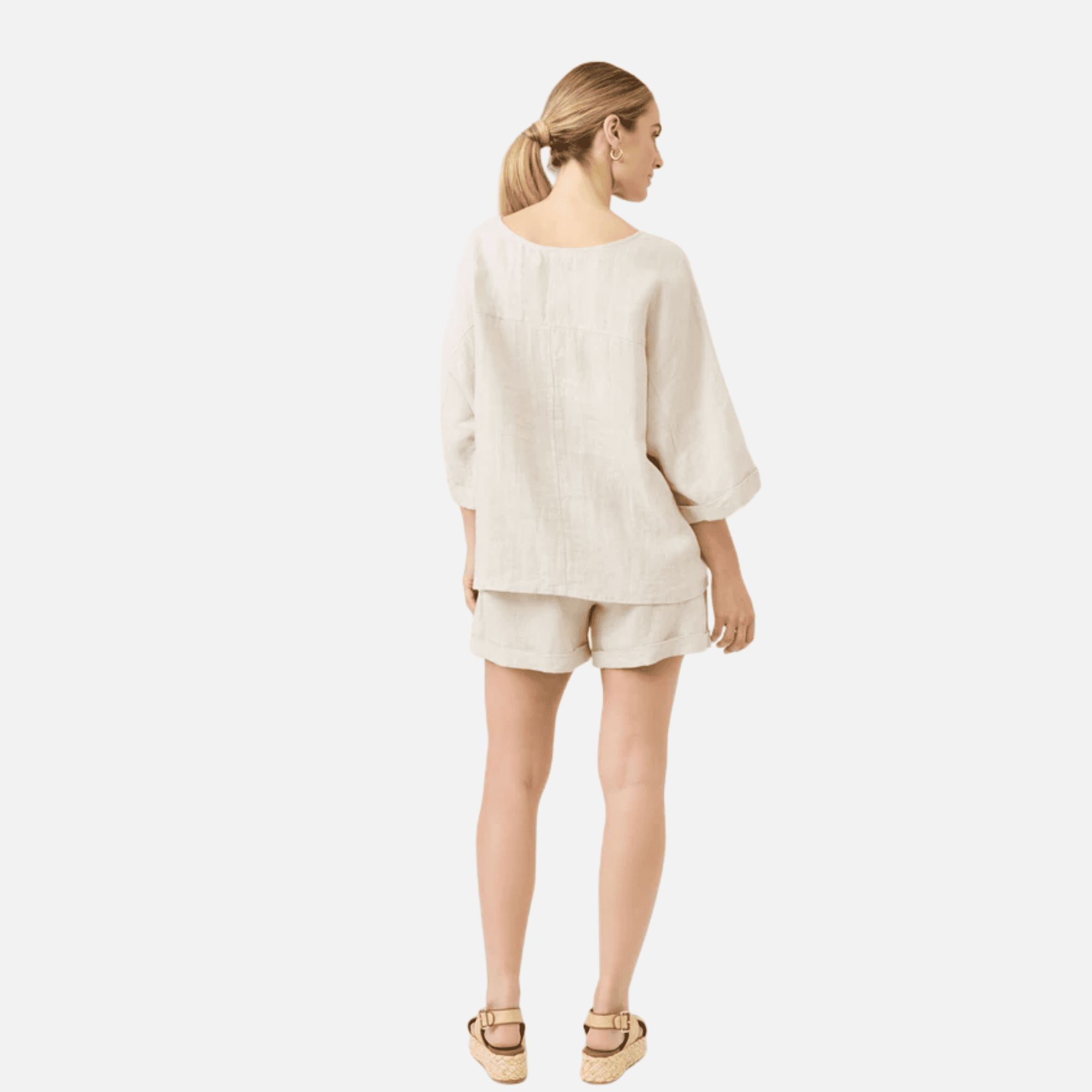 Embrace laid-back elegance with the Studio Relaxed Top in Tusk (Stone) by Eb & Ive. Crafted from 100% linen, this minimal yet stylish top features front and back panel detailing for added depth. The wide 3/4 cuffed sleeves create a subtle sophistication, making it perfect for showcasing your favourite accessories. Its hip-length hem adds a relaxed finish, making it ideal for pairing with linen shorts or pants for a chic, natural look. Whether you're heading to a sunny getaway or enjoying a casual day out, this top will keep you cool and effortlessly stylish.