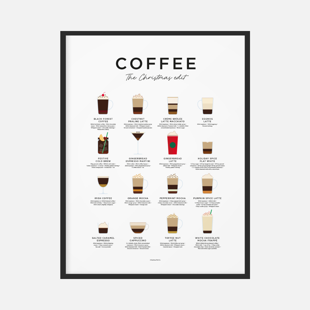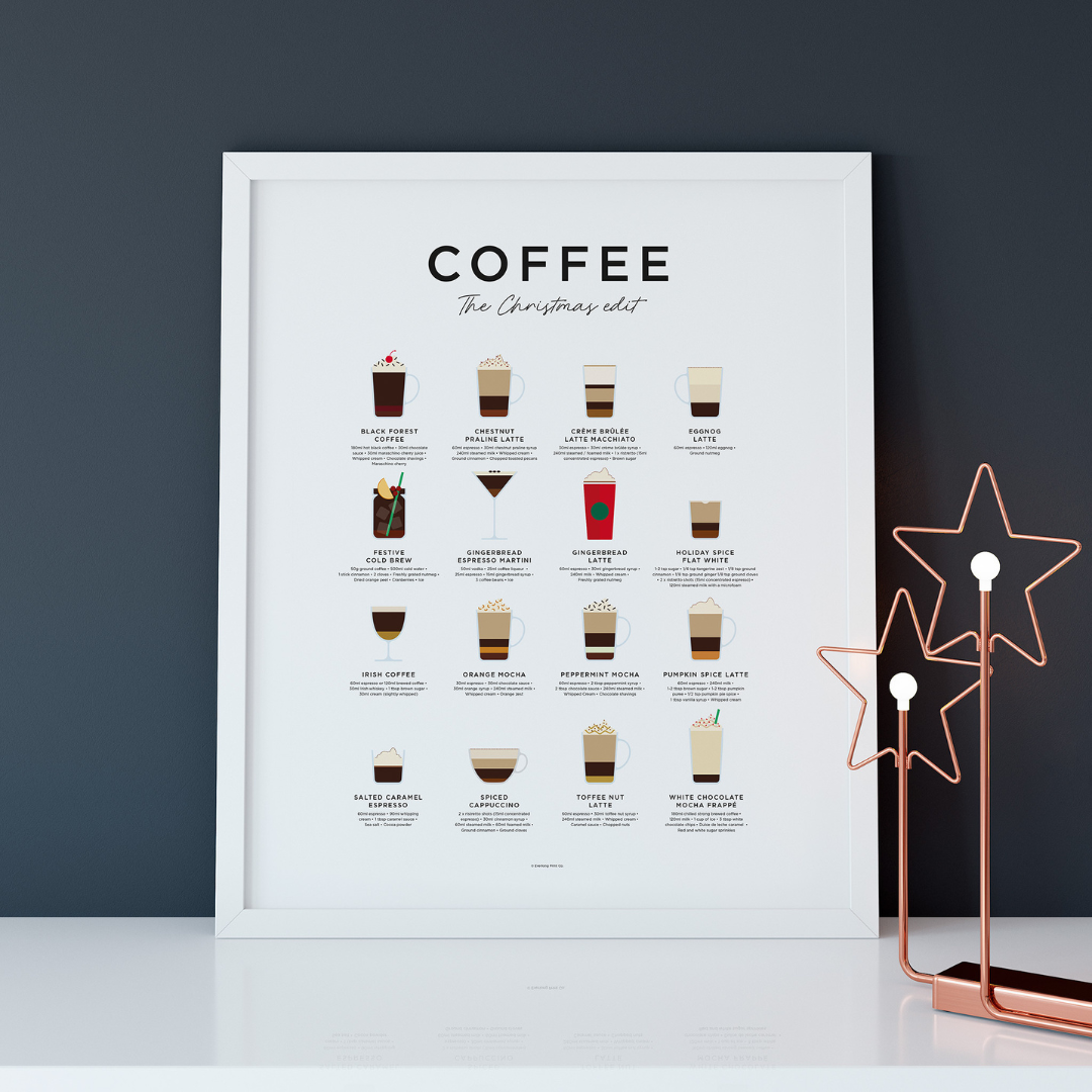 From Gingerbread and Toffee Nut Lattes, to Holiday Spice Flat Whites and Festive Cold Brews – our Christmas Coffee Print brings together all the festive favourites in one curated art print. Complete with measurements for making all the festive coffees, you’ll find everything you need in this fun and functional print.