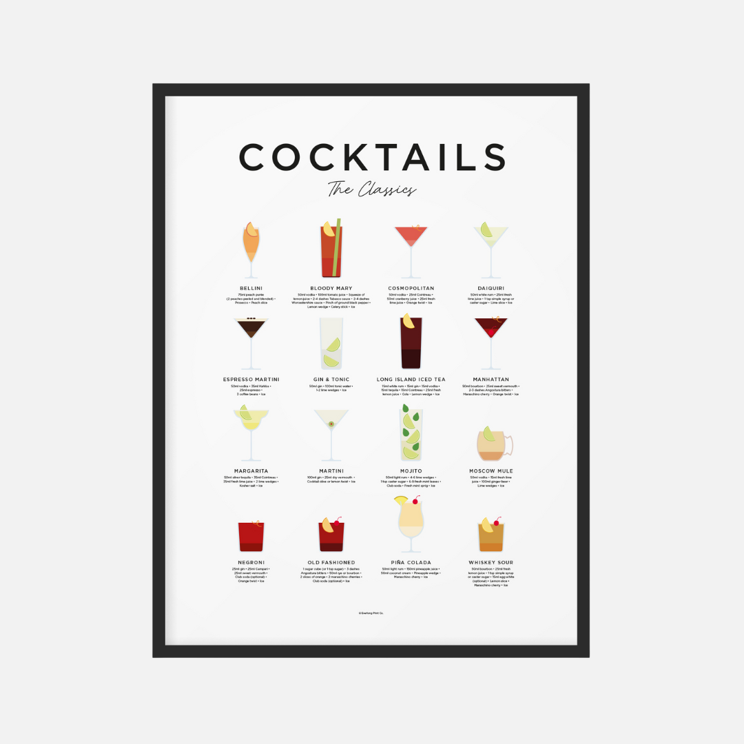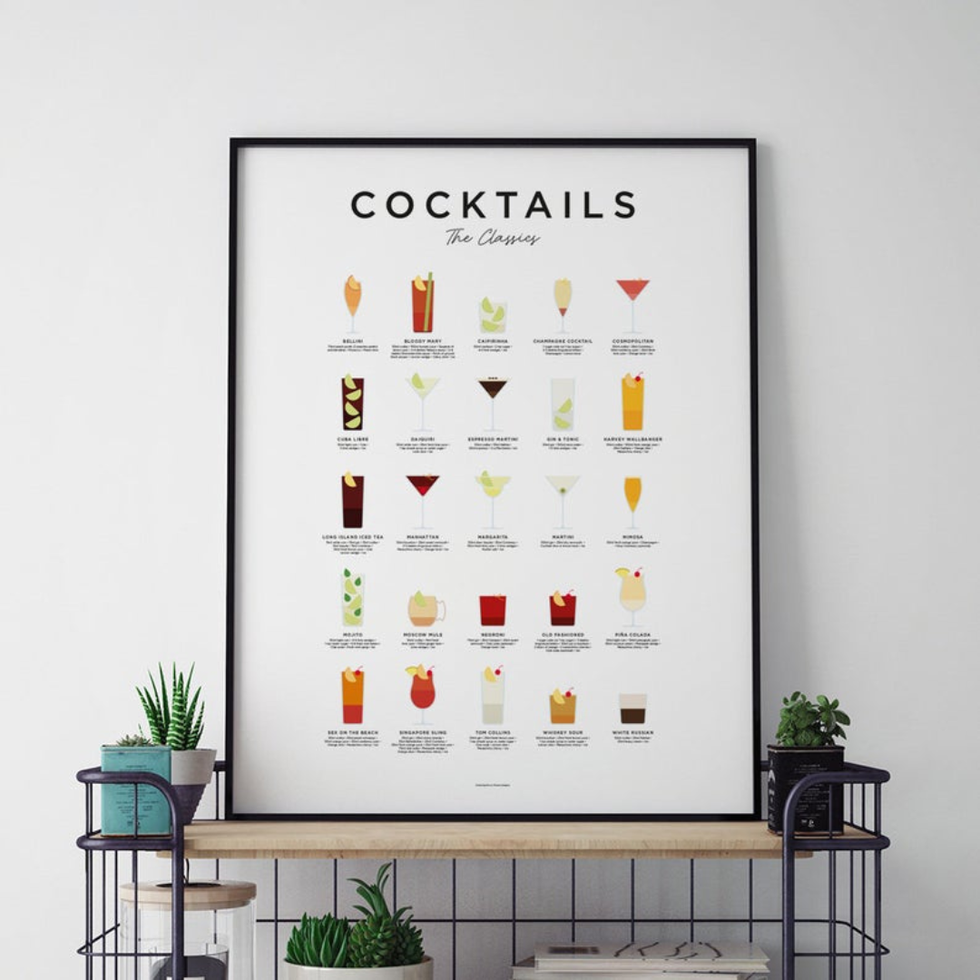 Every hour is happy hour with these fabulous prints from Everlong Print Co. Minimalist in style, this classic cocktail guide functions as a cheat sheet for aspiring mixologists with the illustration and ingredients for each cocktail.