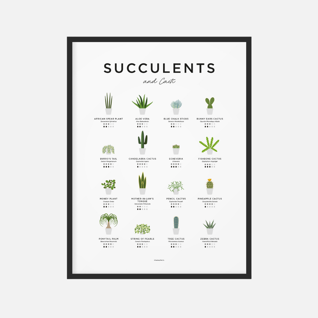 A minimalist art print from Everlong Print Co featuring popular succulent plants and cacti from around the world. Do you know your Aloe Vera from your Mother-in-Law's Tongue? Burro's Tail or String of Pearls? If you are an aspiring plant parent or already proudly rearing a botanical brood, then this is the print for you!
