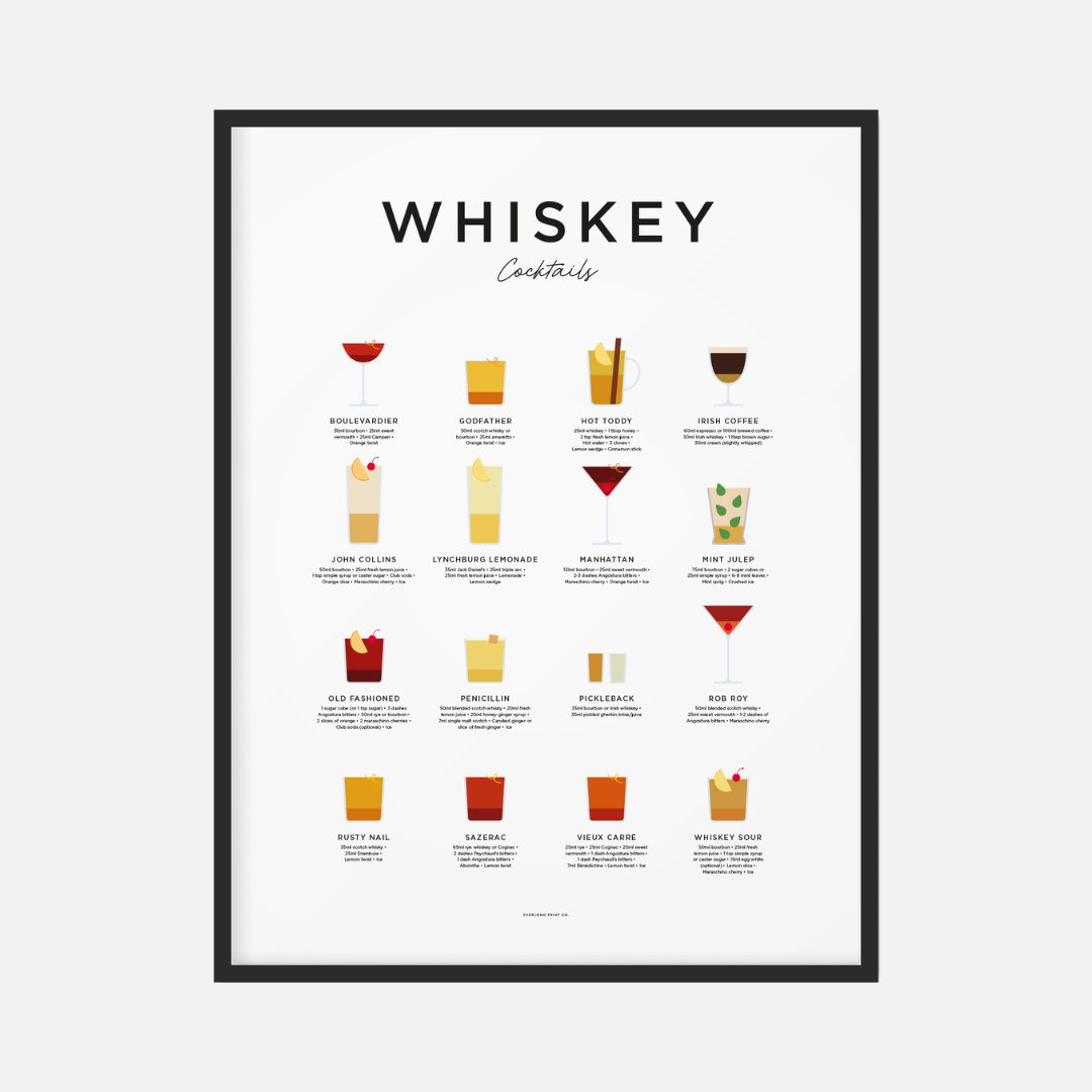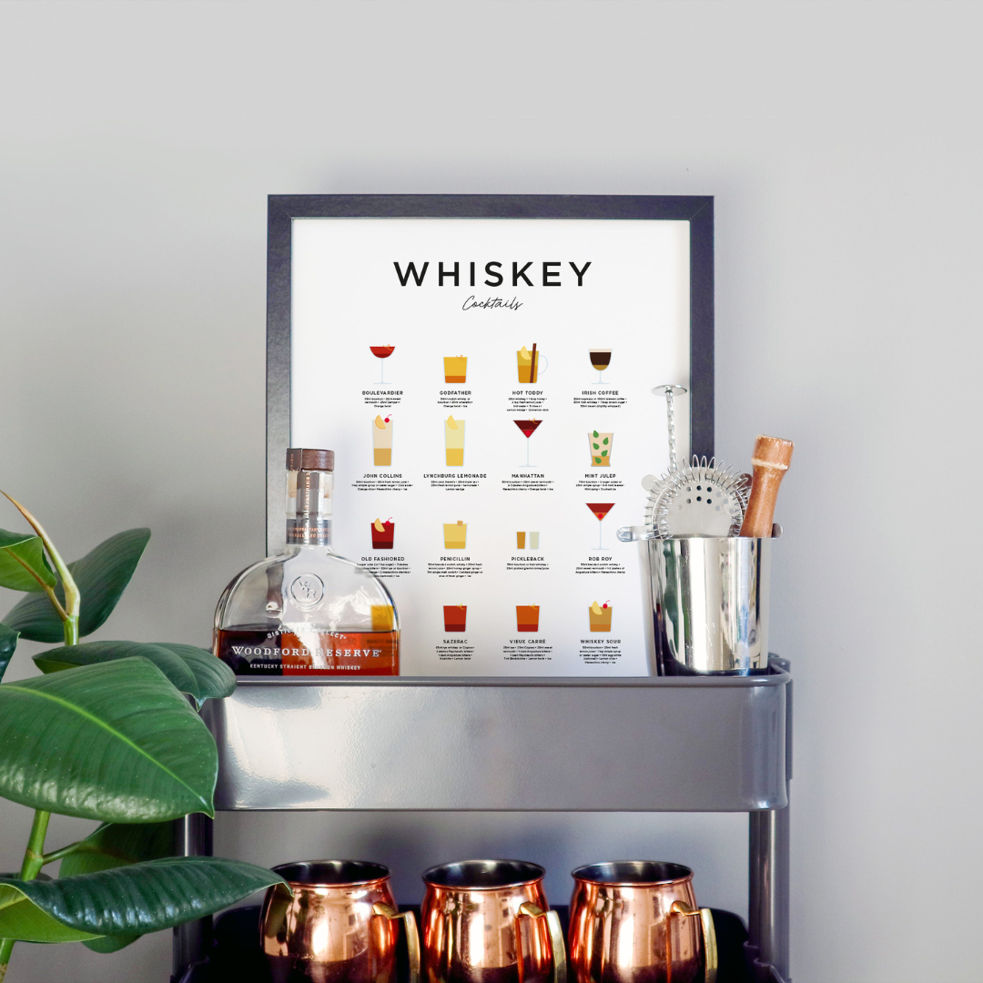 The perfect print for those that love their drinks strong and smooth. From Manhattans and Mint Juleps, to Old Fashioneds and Hot Toddys – unleash your inner mixologist with these iconic whiskey cocktails. Whether you prefer a sweet bourbon, a rich rye, or the body and flavour of a warming whisky - impress your guests by effortlessly making your favourite whiskey cocktails from home.