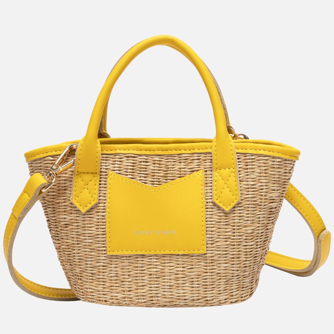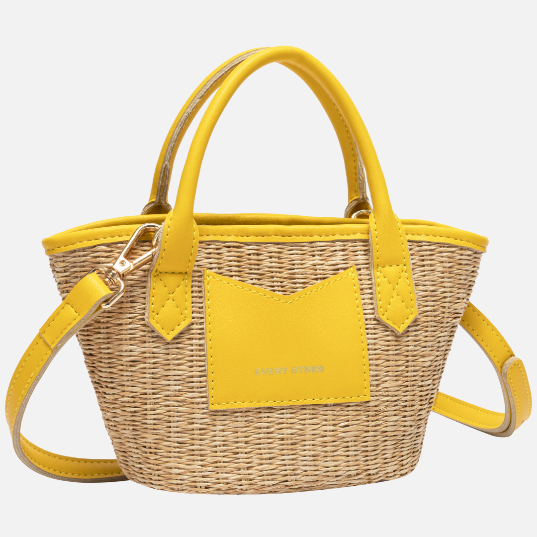 A classic raffia grab handle tote bag with a detachable shoulder strap in sunny yellow from Every Other. This Sereno bag comes with a handy pouch to store all your everyday essentials. A timeless style to make the perfect wardrobe essential this spring/summer.
