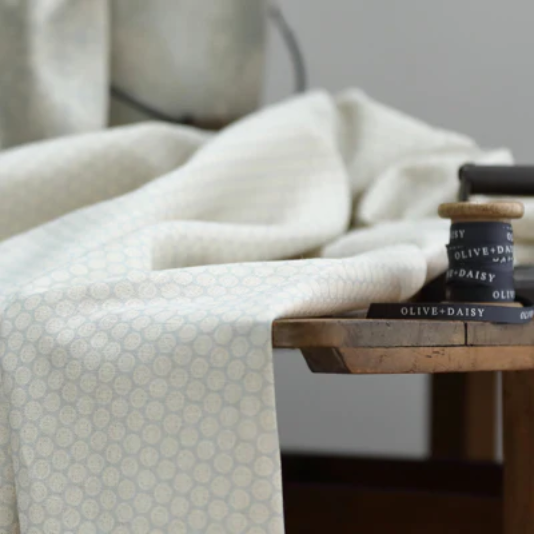 The stunning Agnes Blotch design from Olive & Daisy features a two-tone, small scale geometric pattern. It has a softly coloured classic palette with a small circlular motif .This print is available in 5 gorgeous colourways.