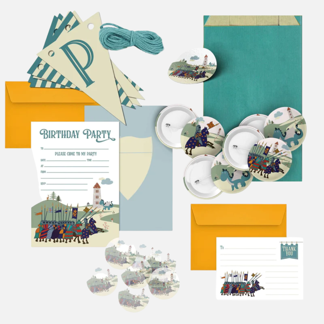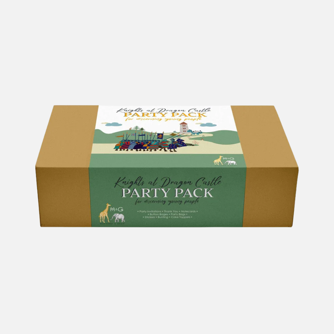 Children's themed birthday party box in the Knight at Dragon Castle design from Mustard & Gray. This Party Box contains all the stationery you need to throw a fantastic party for even the most discerning children. These party boxes include invitations and envelopes, party badges, rice paper cake toppers, activity sheets, crayons, thank you note cards and envelopes.