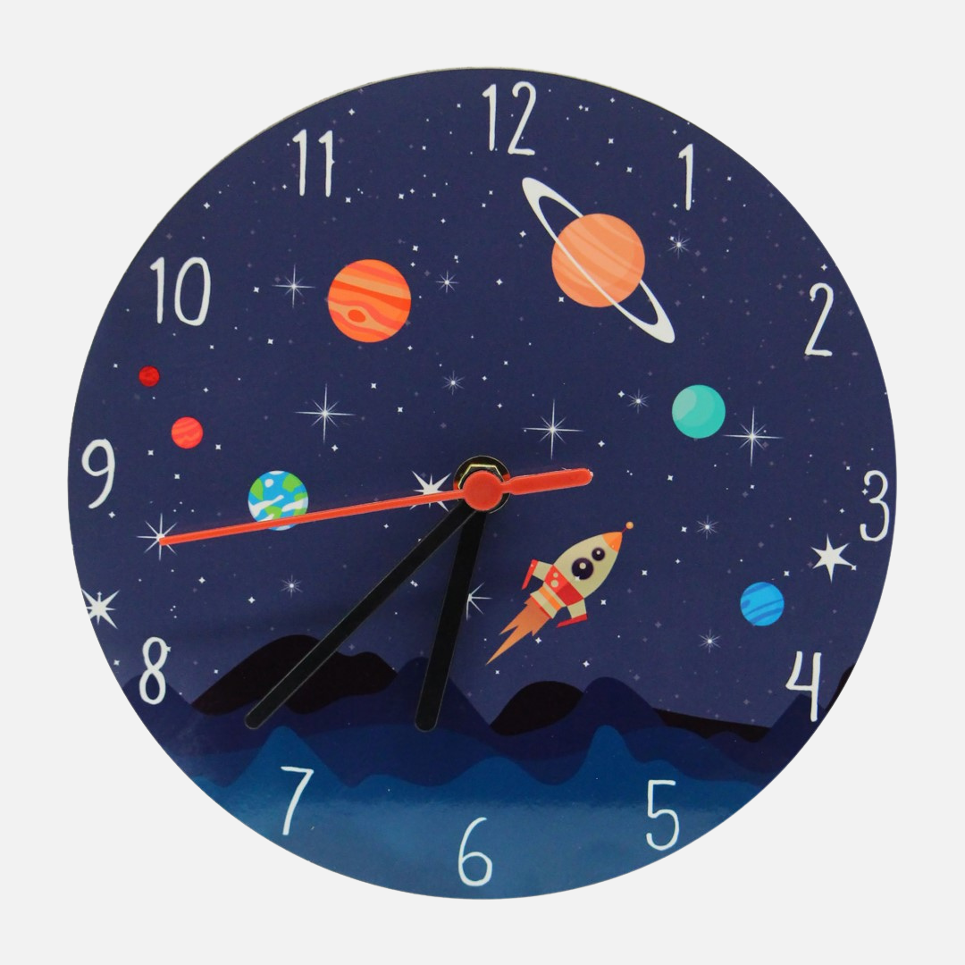 A colourful clock featuring a lunar landscape filled with the planets, twinkling stars and of course a space rocket! The ideal choice for space gazers. Although not overtly educational this clock sparks the imagination and in turn the beginning of understanding "how to tell the time".