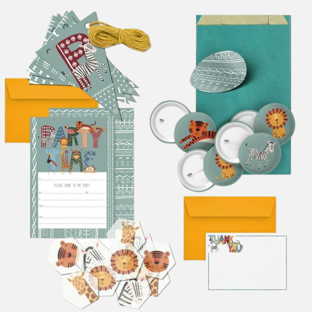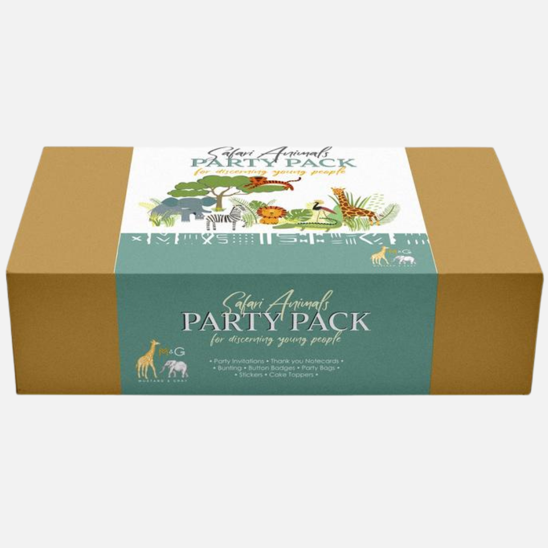 Children's themed birthday party box in the Safari Animal design from Mustard & Gray. This Party Box contains all the stationery you need to throw a fantastic party for even the most discerning children. These party boxes include invitations and envelopes, party badges, rice paper cake toppers, activity sheets, crayons, thank you note cards and envelopes.