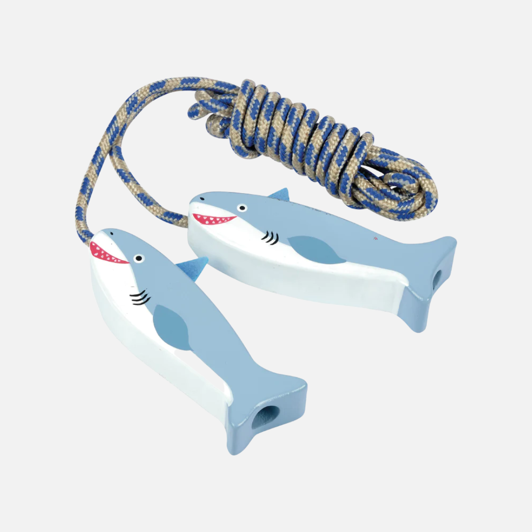HOP…SKIP….JUMP….!! Make skipping extra fun with this friendly Shark Skipping Rope from Floss & Rock. Featuring hand painted wooden handles.