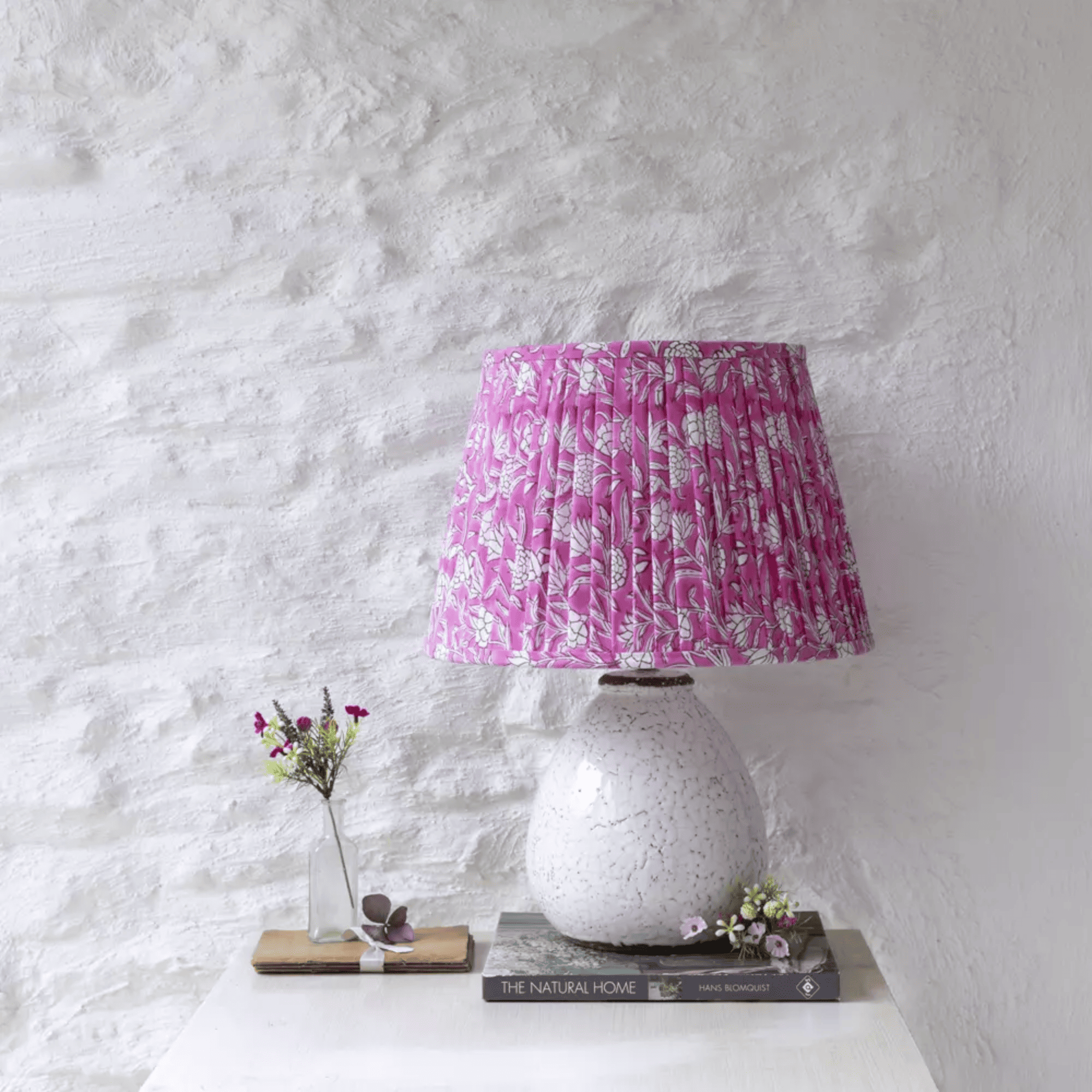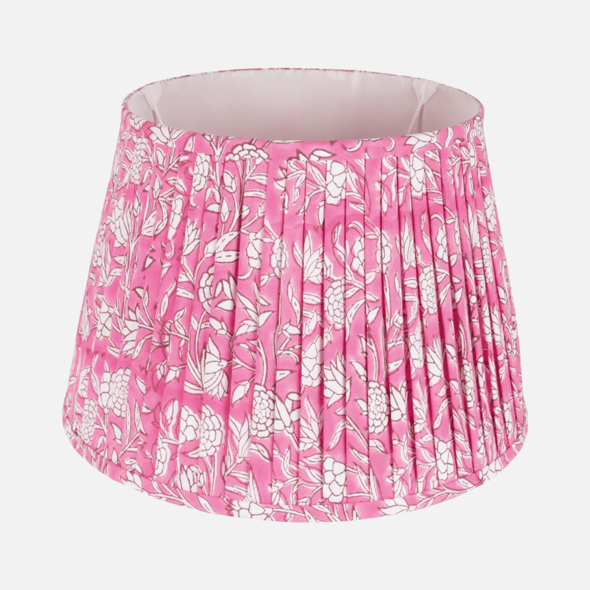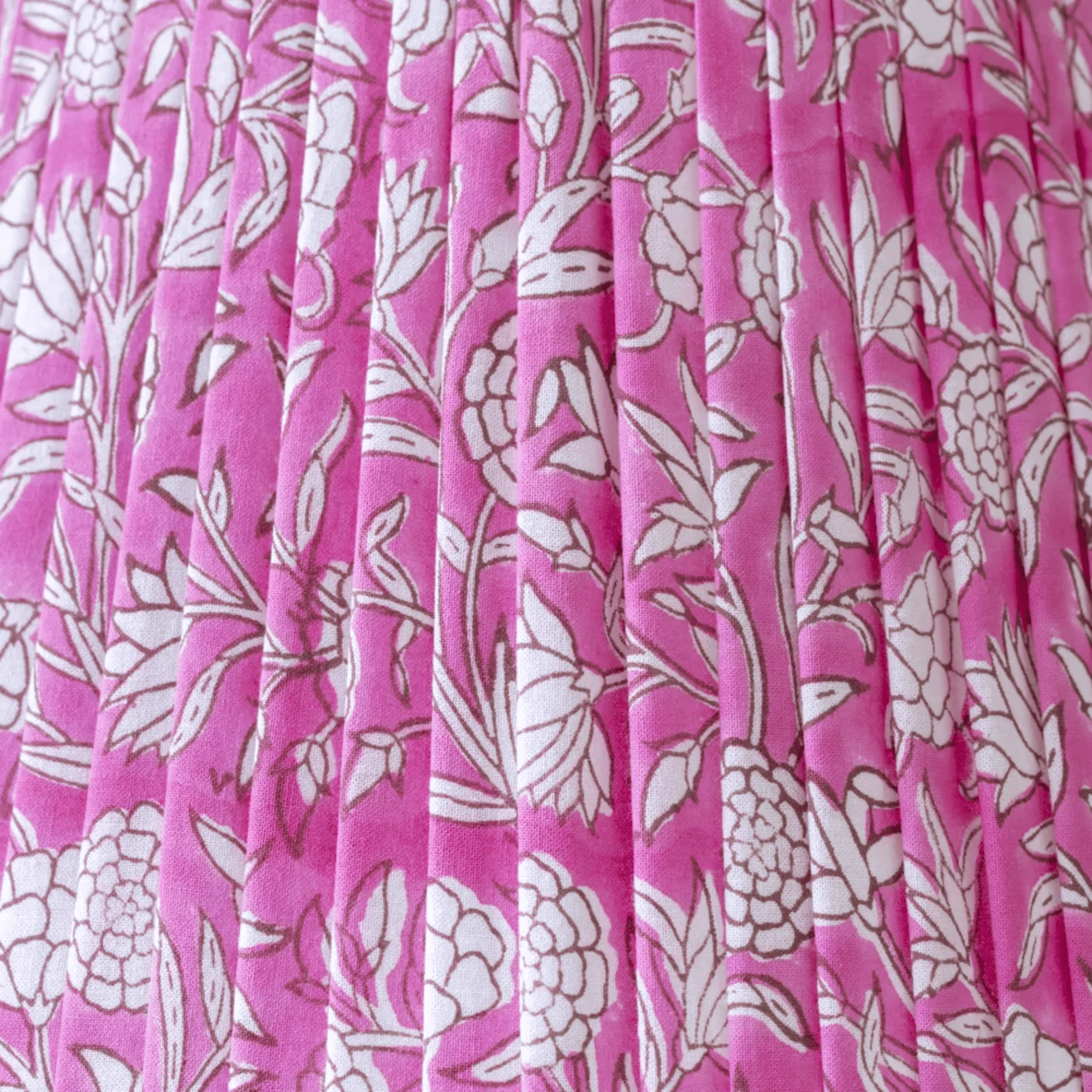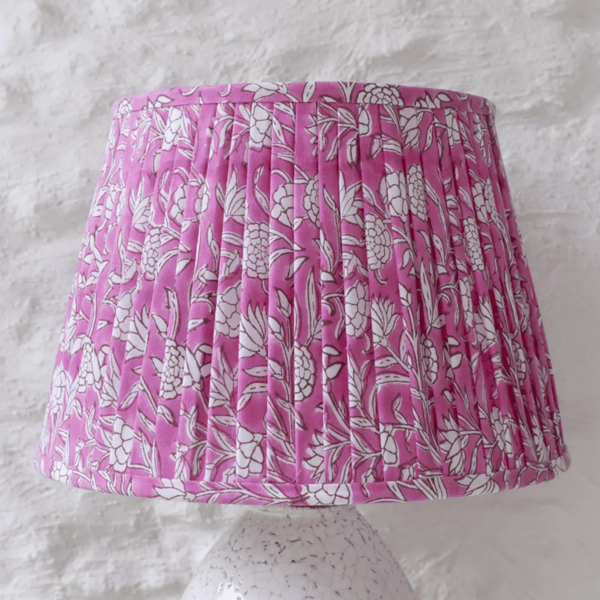 Add warmth, colour, and artisan charm to your space with this exquisite pleated lampshade, handcrafted in India using traditional hand block printing techniques. Featuring a vibrant floral print in bright pink and crisp white, this piece delivers both elegance and character.