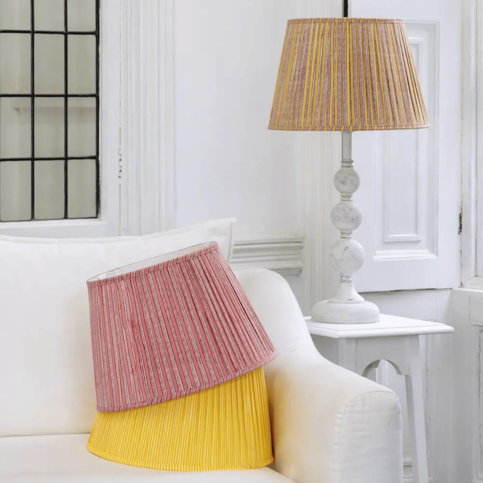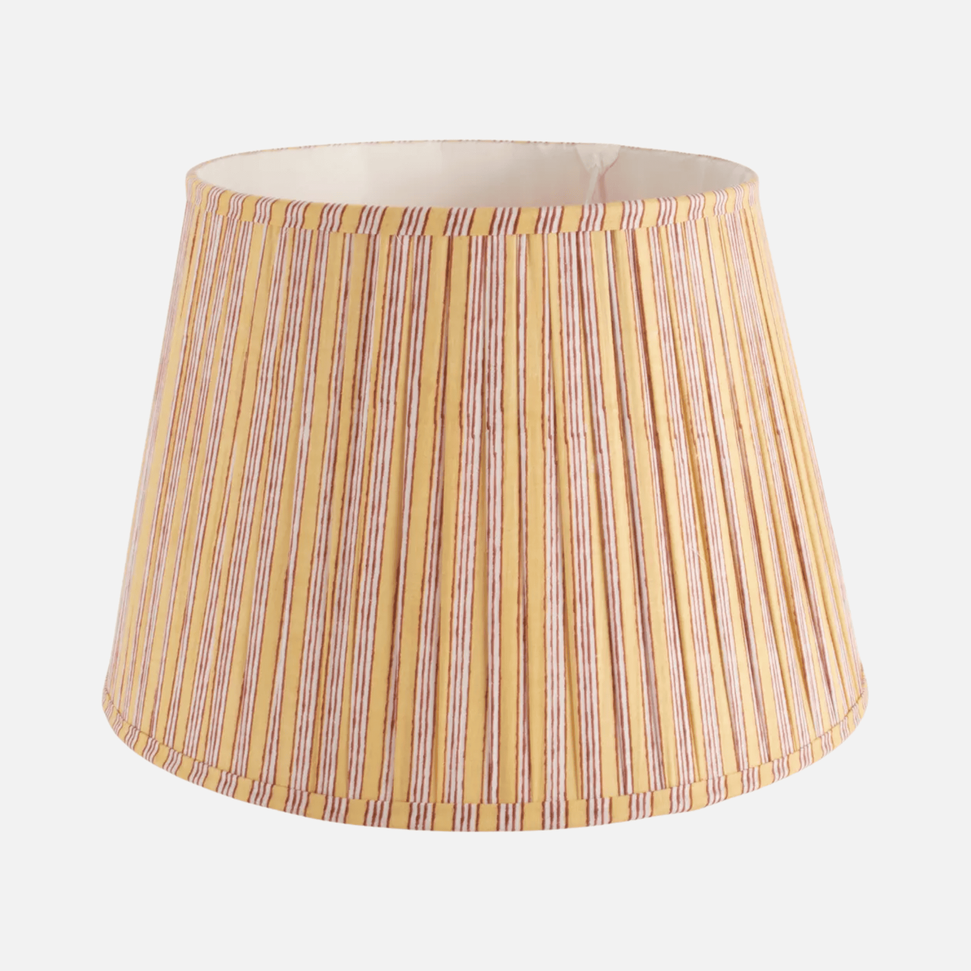 Add warmth and character to your space with this beautifully crafted pleated lampshade in a rich butterscotch yellow and soft red stripe. Handmade using traditional Indian hand block printing techniques, each piece is a unique celebration of colour and craftsmanship.