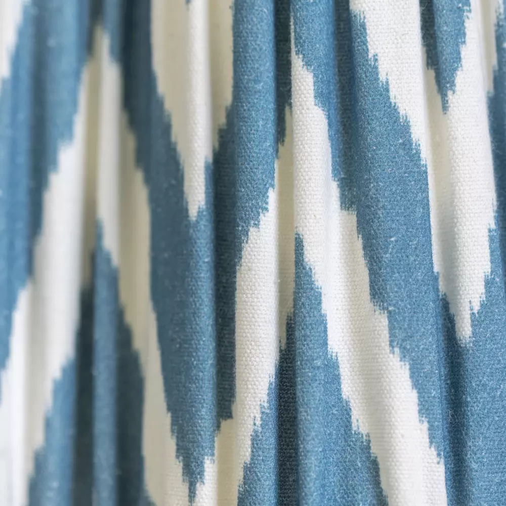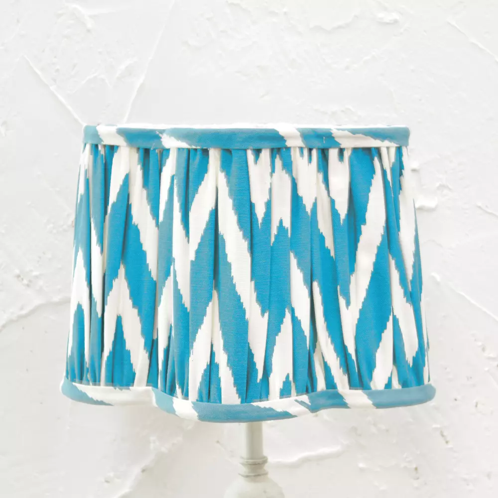 Add a touch of elegance and sophistication to your home with this exquisite pleated cotton lampshade by Grand Illusions. Crafted to perfection, this lampshade features a charming scalloped shape, measuring 35 x 23 cm, and comes with matching trim that enhances the beautiful blue ikat design. Create a warm and inviting atmosphere with this lampshade, which seamlessly blends classic artisan techniques with a contemporary look. It's the perfect addition to any home decor style!