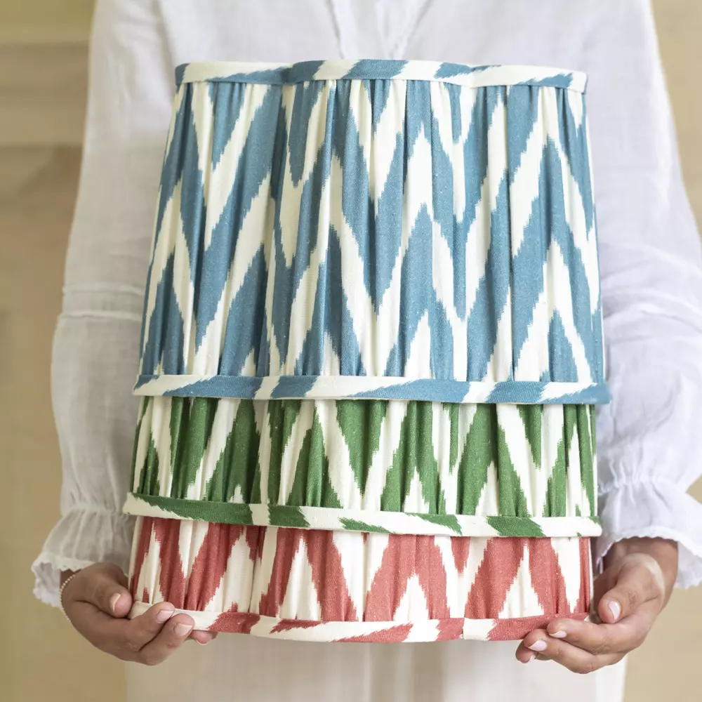 In addition to the striking blue ikat, this lampshade is also available in earthy green and soft pink ikat patterns, offering versatile options to suit your personal style or home décor. Whether you’re looking to brighten up a bedroom, living room, or reading nook, this shade effortlessly elevates any space, casting a warm and inviting glow that adds both comfort and style to your surroundings.