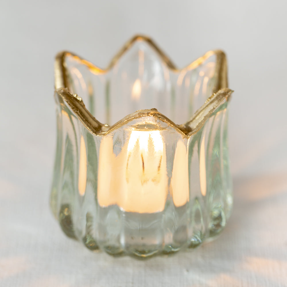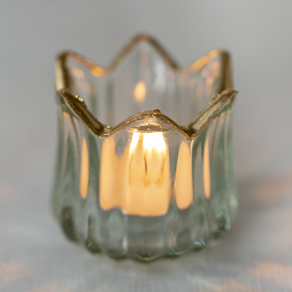 Elevate the ambiance of your home with this stunning decorative glass T-Light from Grand Illusions. The elegant gold rim adds a touch of sophistication to any room, making it perfect for dinner parties or creating a warm, inviting atmosphere in your living room. This crown-shaped glass is a beautiful addition to your holiday decor, and can also be enjoyed all year round.