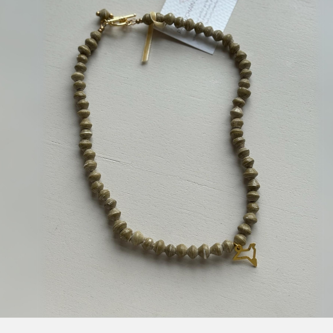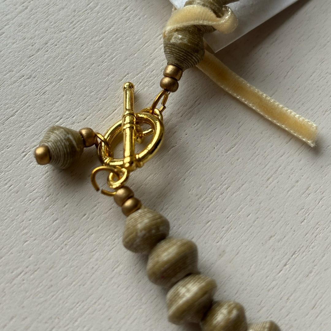 The Charlie Choker from Paperchain Jewellery is a choker featuring and t-bar clasp with cement paper beads and the signature Paperchain bird. This choker can be worn with the t-bar to the front or as a closure to the back.