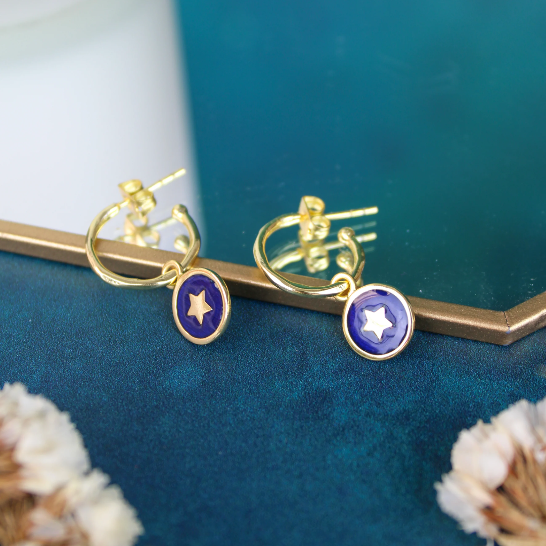 This elegant pair of Enamel Star Mini Hoop Earrings by My Doris showcases a striking navy star on a sleek gold hoop, making for a timeless and minimalist aesthetic.