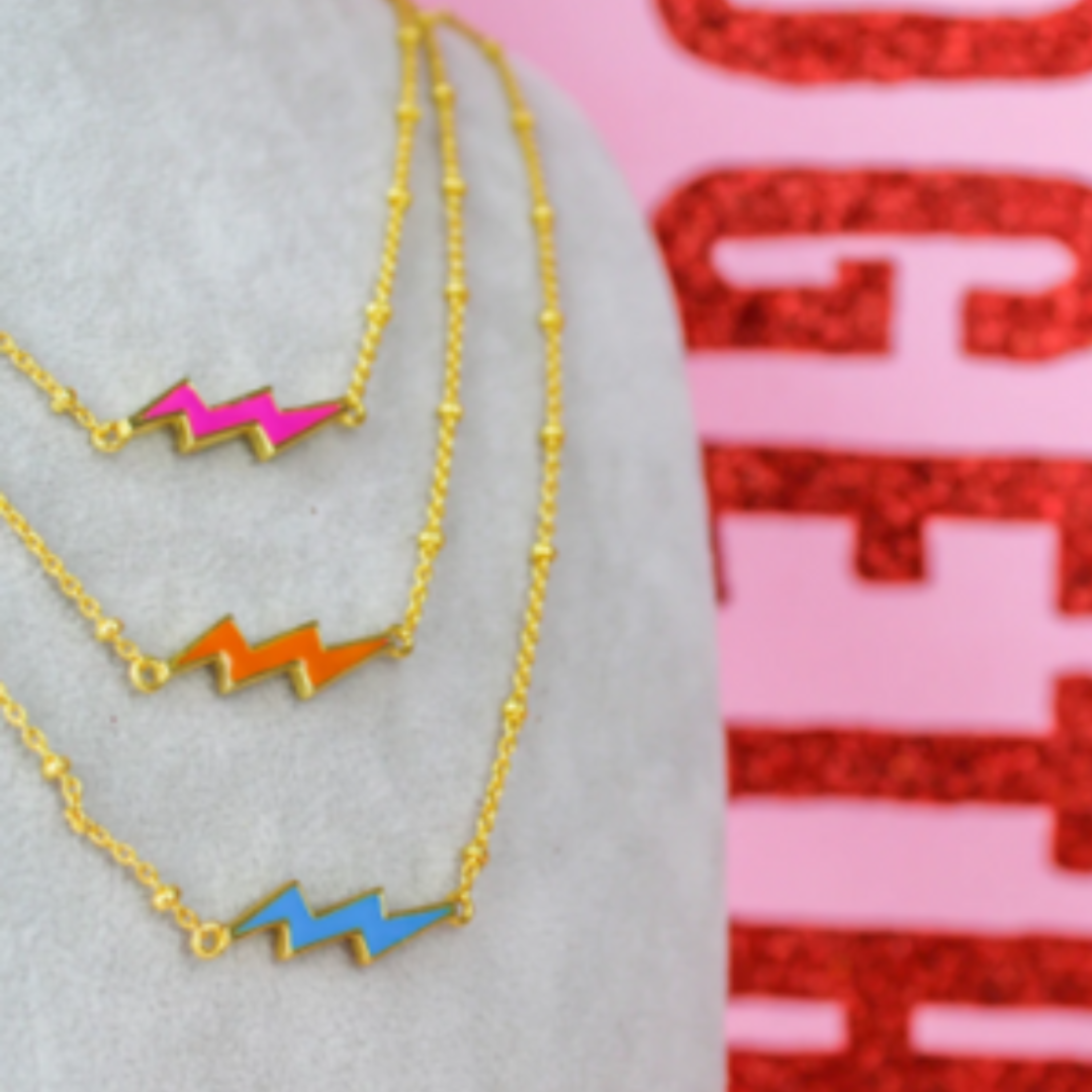 This is a lovely asymmetrical pink lightning bolt necklace by My Doris. Set on a gold chain.
