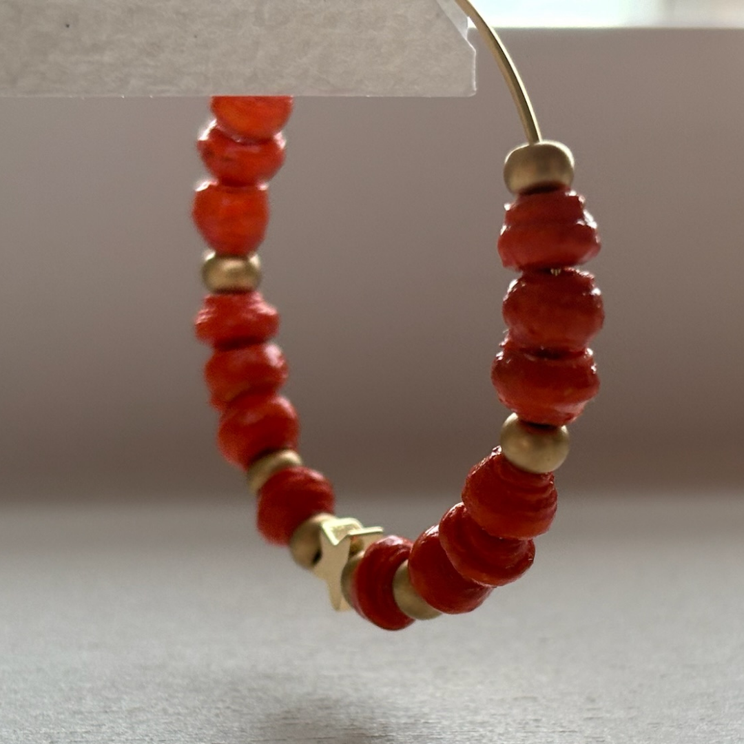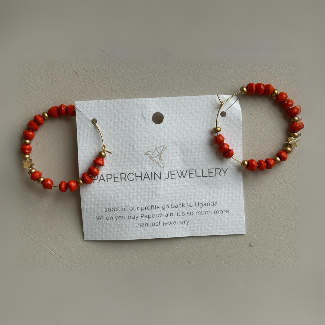 The Ochaya Hoop Earrings from Paperchain Jewellery feature small orange paper beads with a centre star placed on a large sized fine gold hoop. The perfect accessory for this seasons colour palette.