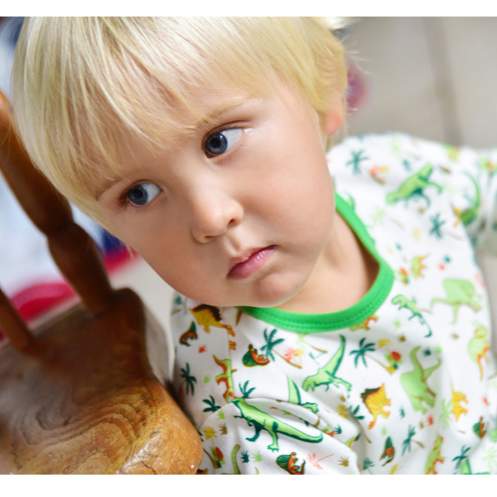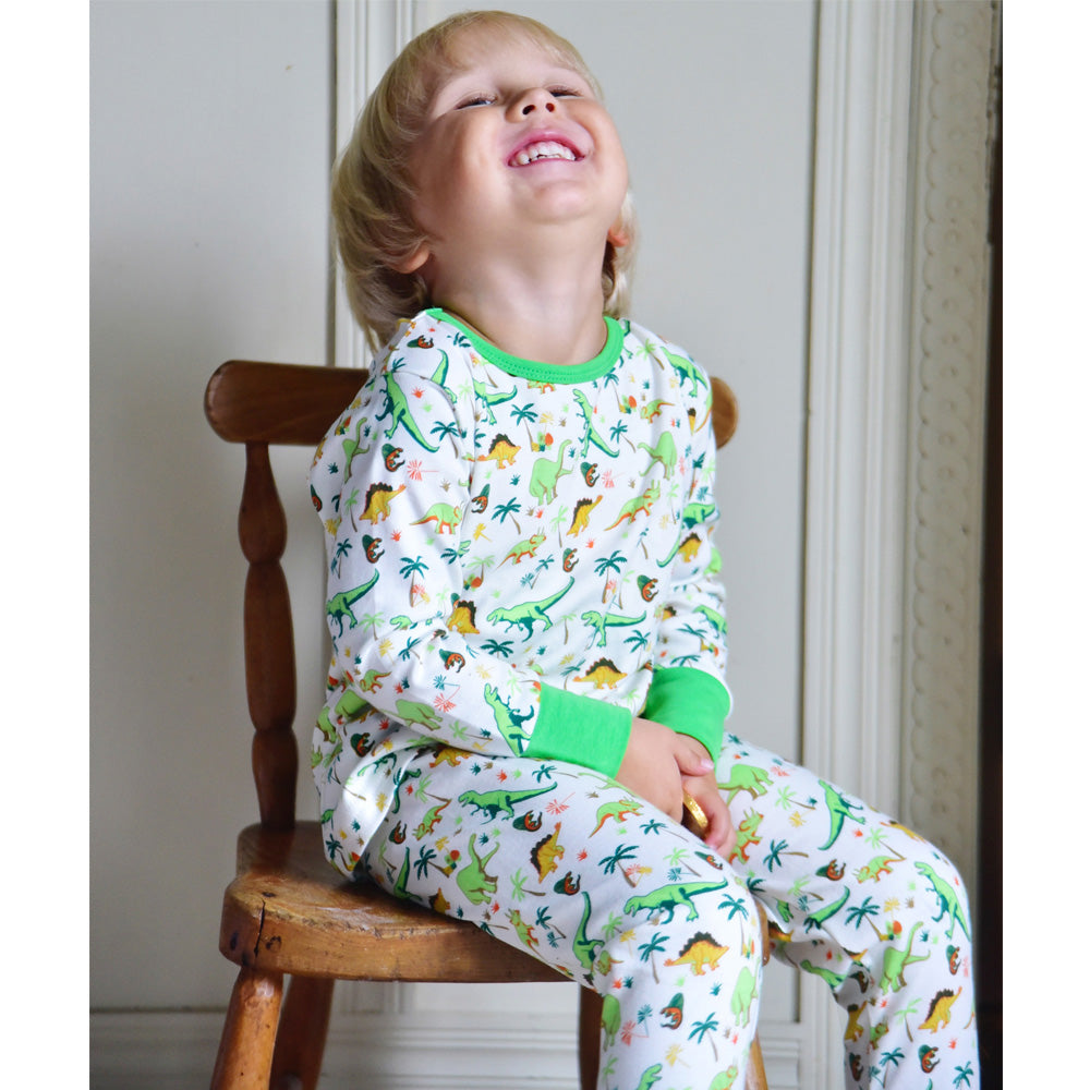 Experience a charming storybook-like Dinosaur scene with Powell Craft's cotton knit pyjamas. This dinosaur print is one of our customer favourites and features T-rex, triceratops, and stegosaurus, in greens and yellows, run riot through vegetation and palm trees against a cream background.