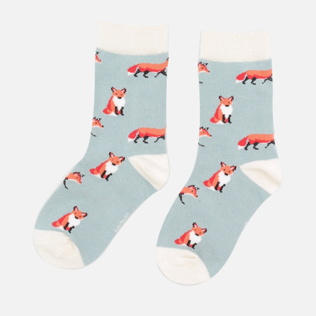 A cute pair of Miss Sparrow socks featuring playful foxes on a soft duck egg blue background. Made from a breathable cotton blend, they’re designed for comfort, durability, and everyday wear.