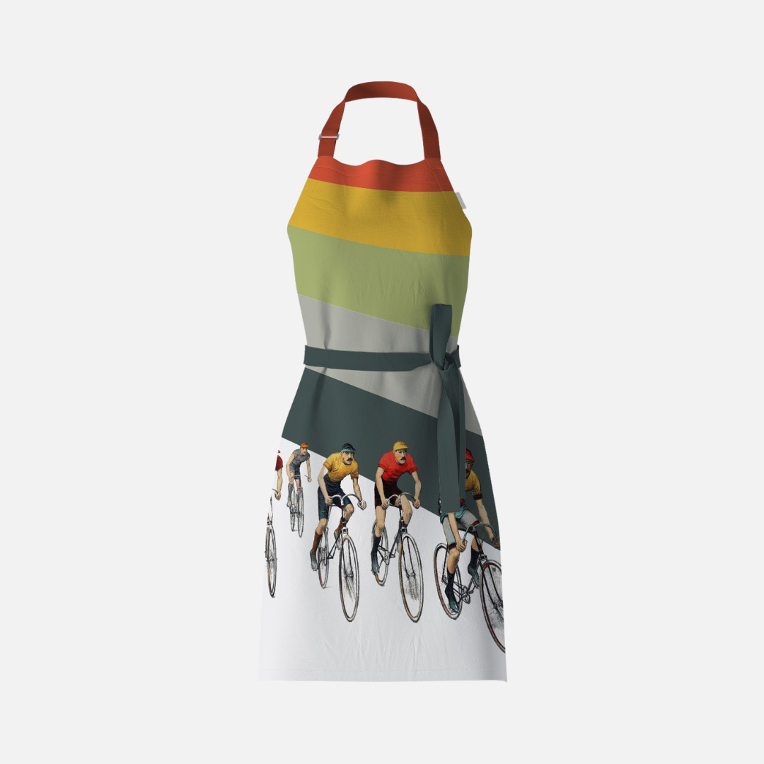Experience the thrill of the finish line with Mustard & Gray's Cameron's Vintage Bicycle Apron, designed with vibrant colors and bold stripes inspired by the classic artwork of John Cameron. Become a "wheelman" and add a pop of energy to your cooking routine with this must-have accessory!