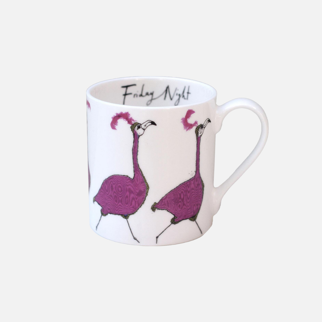 Add a splash of fun to your tea or coffee routine with this vibrant Anna Wright mug, featuring five fabulous flamingos ready to party. On the inside rim, the handwritten text “Friday Night” sets the tone, while a pink feather at the base offers a cheeky little surprise as you finish your drink.