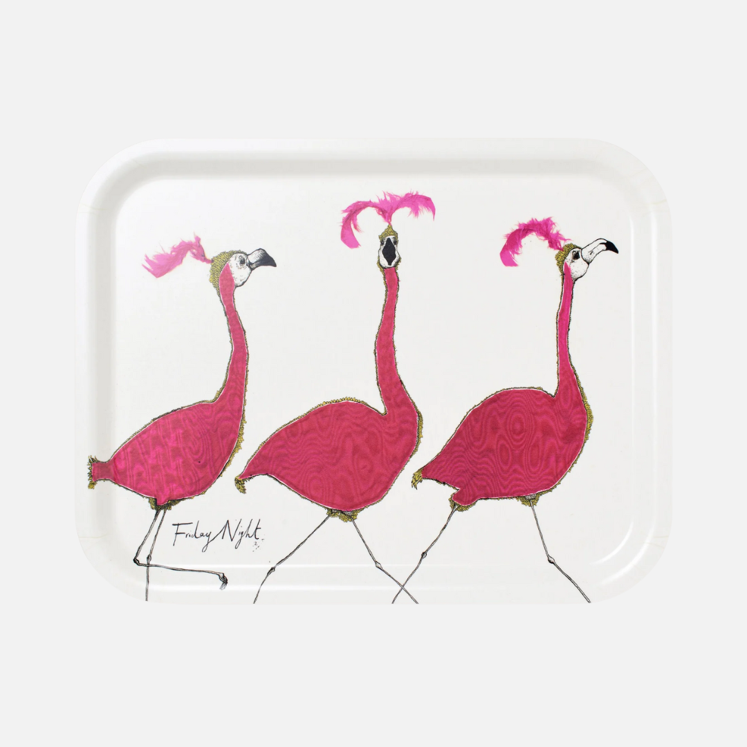 This stunning birch veneer and melamine tray features three ready to party flamingos and the handwritten text ‘Friday Night’, from artist and illustrator Anna Wright.