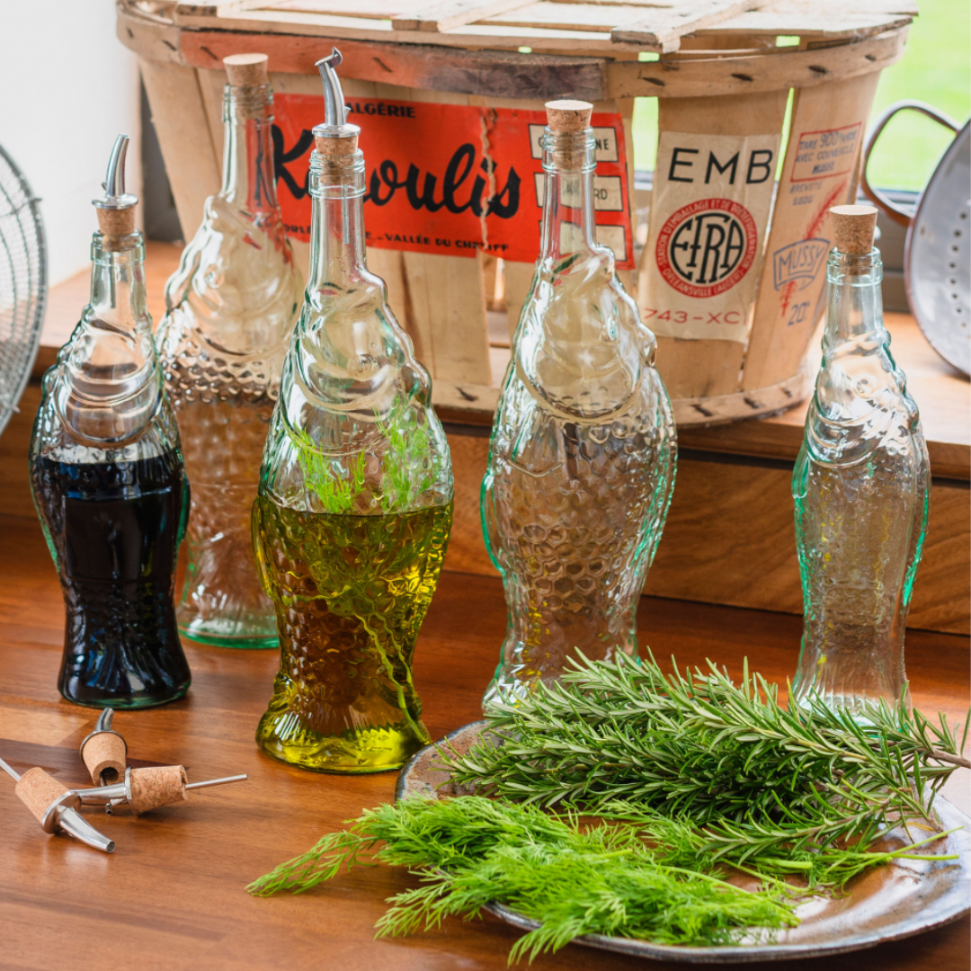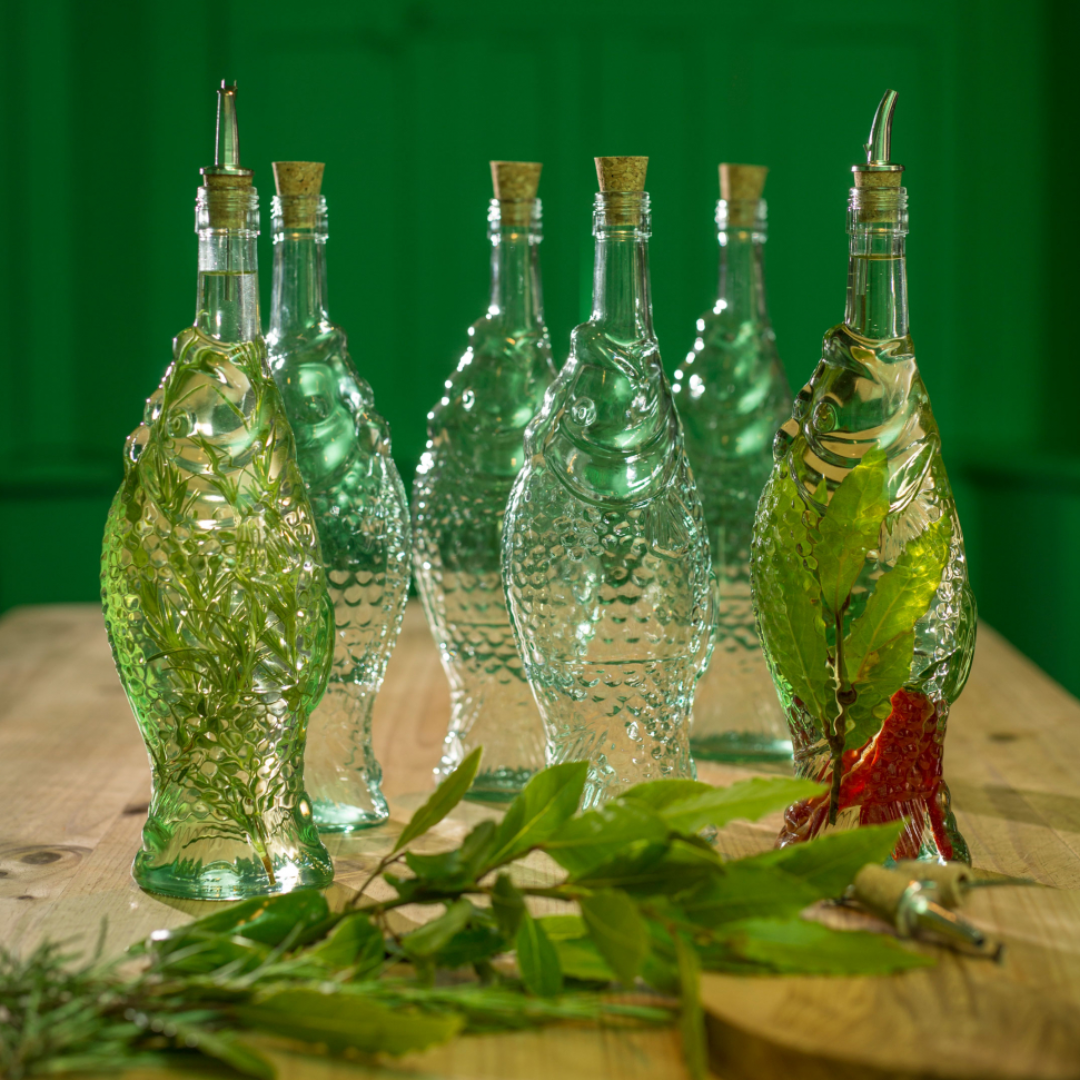 Recycled green glass fish shaped bottles from Italy in two sizes with a plain cork stopper. Perfect as an oil or balsamic decanter, cork stoppers with metal pourers are available separately.