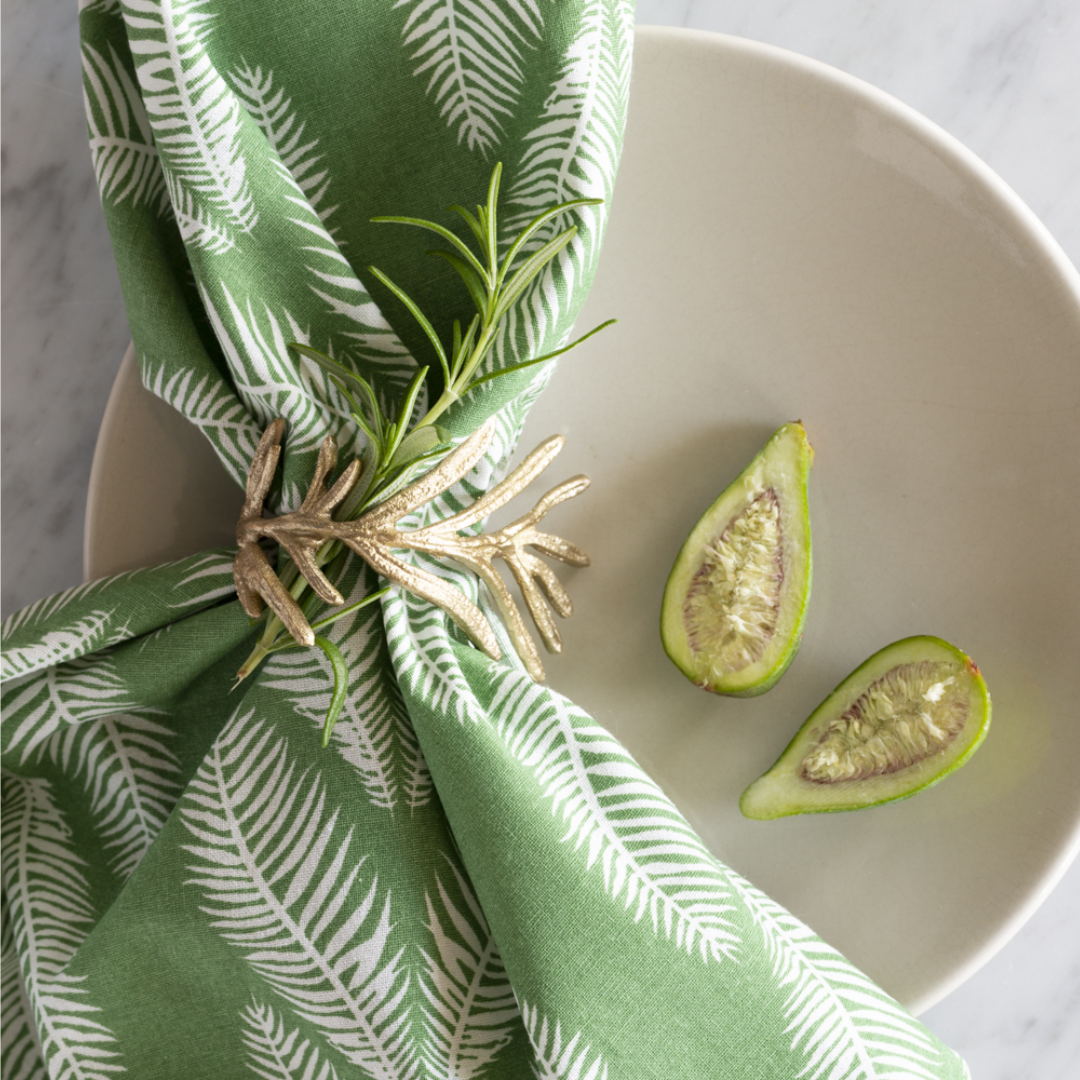 Adorn your dinner table with the addition of these 100% cotton Maya Napkins, a beautiful bright green design with a botanical white leaf pattern, perfect for embellishing your interior.