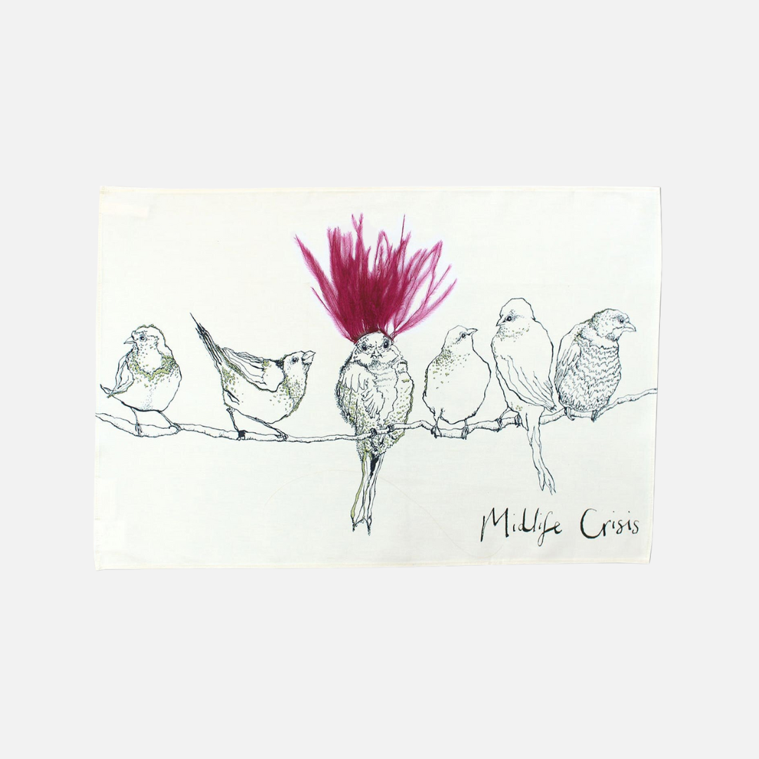 A crisp and classic tea towel from Anna Wright illustrated with a huddle of garden birds, one with a rather funky hairdo, and the handwritten text ‘Midlife Crisis’.