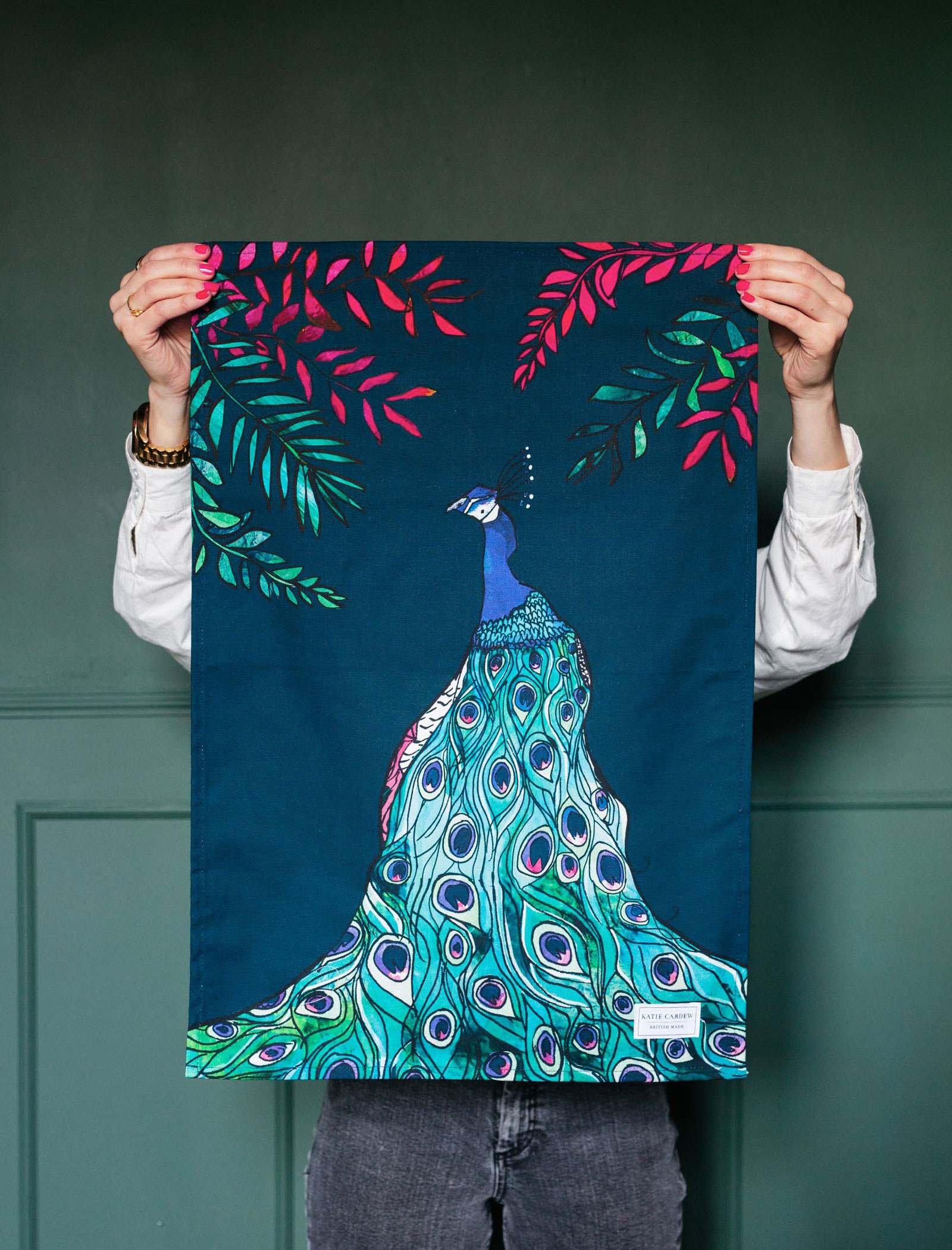 This tea towel by Katie Cardew features her stunning Peacock design showcasing its striking plumage. The beautiful and bold design is a charming addition to any kitchen.