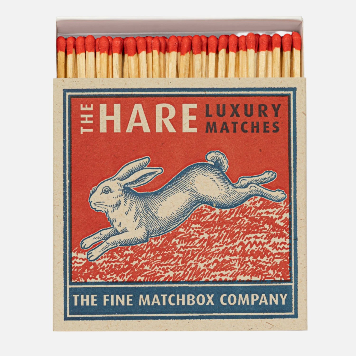 The Hare Luxury square matchbox by Archivist Gallery features a startled looking hare hopping across the countryside on route, or away from, goodness knows - but this vintage design certainly captures the iconic look of a hare in the headlights.