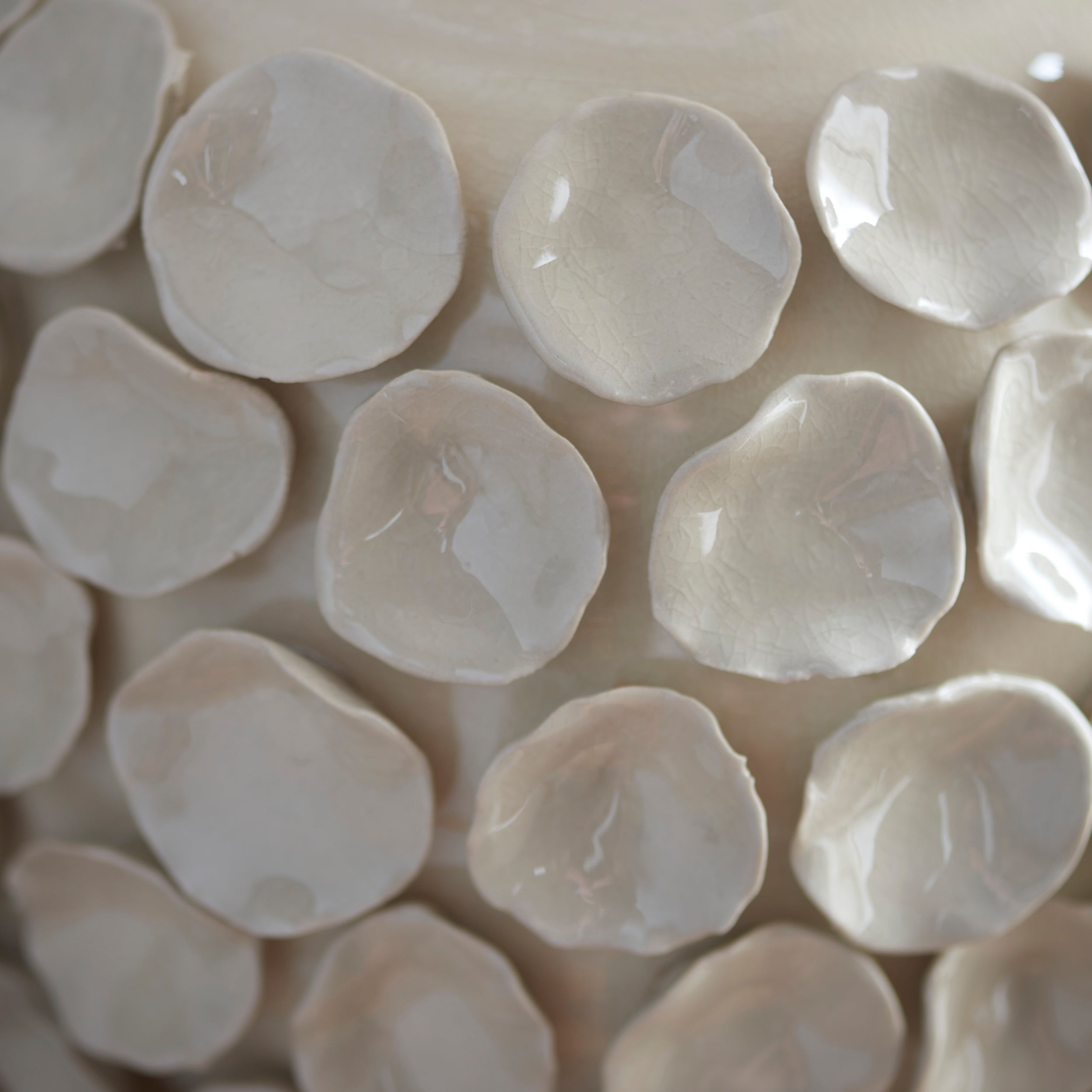 Inspired by organic form and artisanal craft, the Borello Table Base brings a beautifully sculpted presence to any interior. Hand-decorated and finished in a glossy vintage white crackle glaze, it offers subtle texture and a timeless, natural elegance. A brass B22 switched lamp holder and natural braided flex complete the refined detailing. Pair it with one of our 35cm decorative fabric shades or a 32cm raffia shade to create a warm, character-filled focal point.