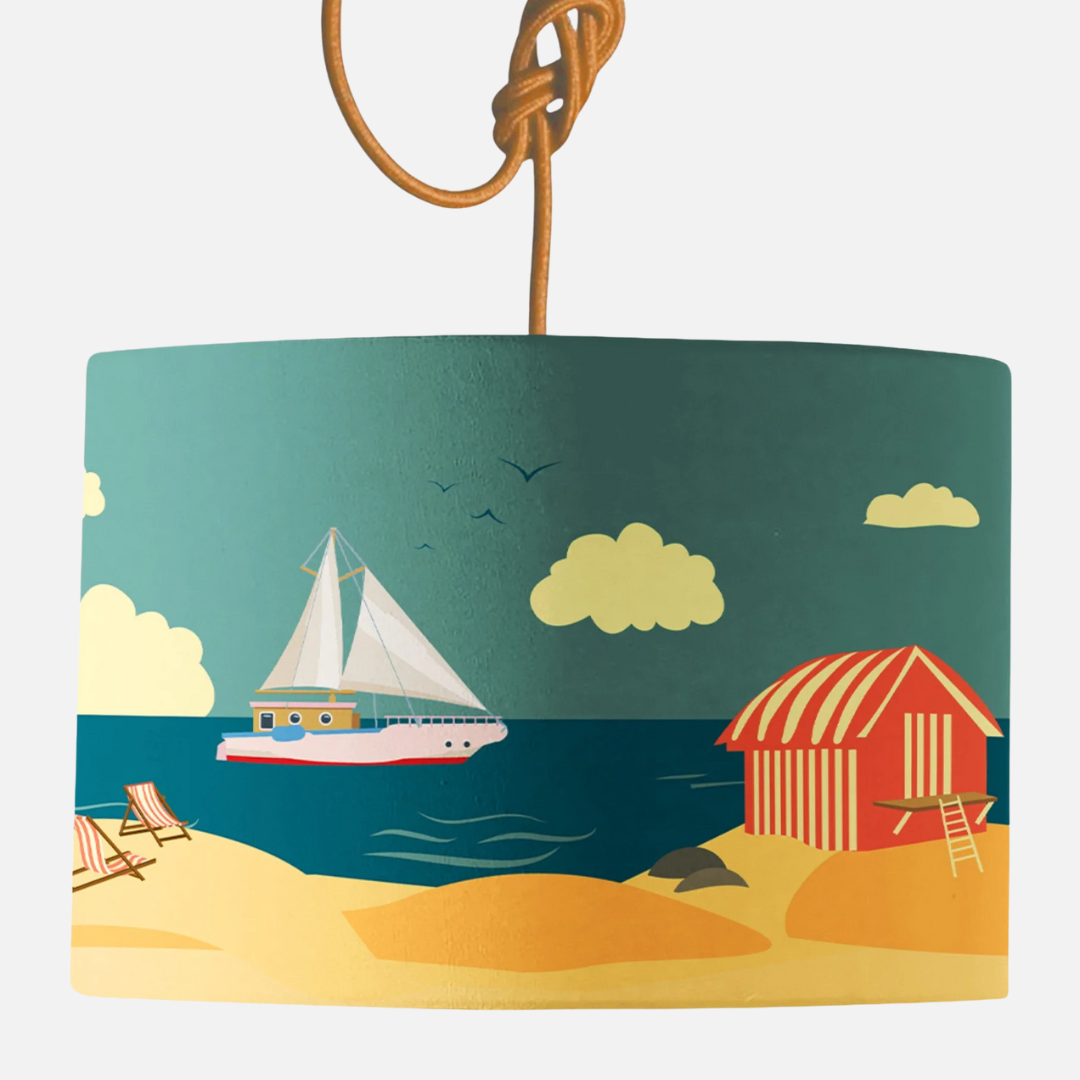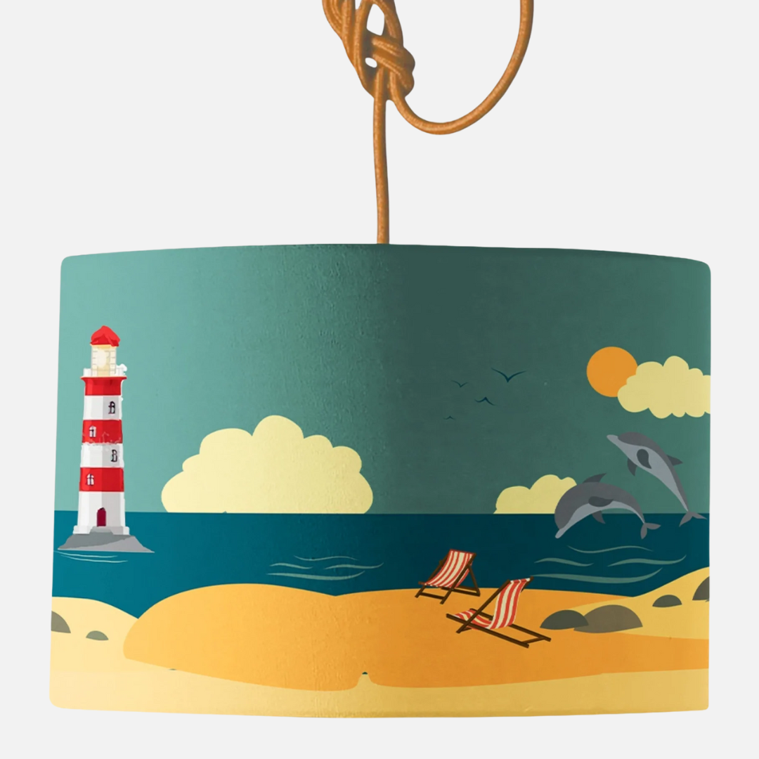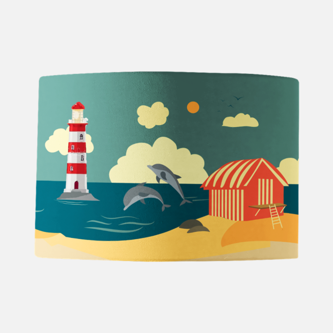A colourful shade adorned with a wonderful design to make us think of quintessentially British seaside holidays. This colourful shade brings us memories of life by the seaside. Beach huts, lighthouses, dolphins, boats and sandcastles. From Padstow to Whitstable, Aberystwyth to Whitby, St Andrews and beyond, we all love a day by the seaside!