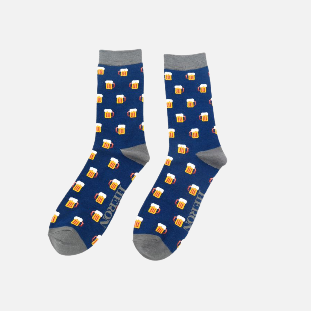 Set against the navy background, the classic beer mug pattern works well with the grey toes, heels and cuffs. The perfect gift for a Craft Beer enthusiast.