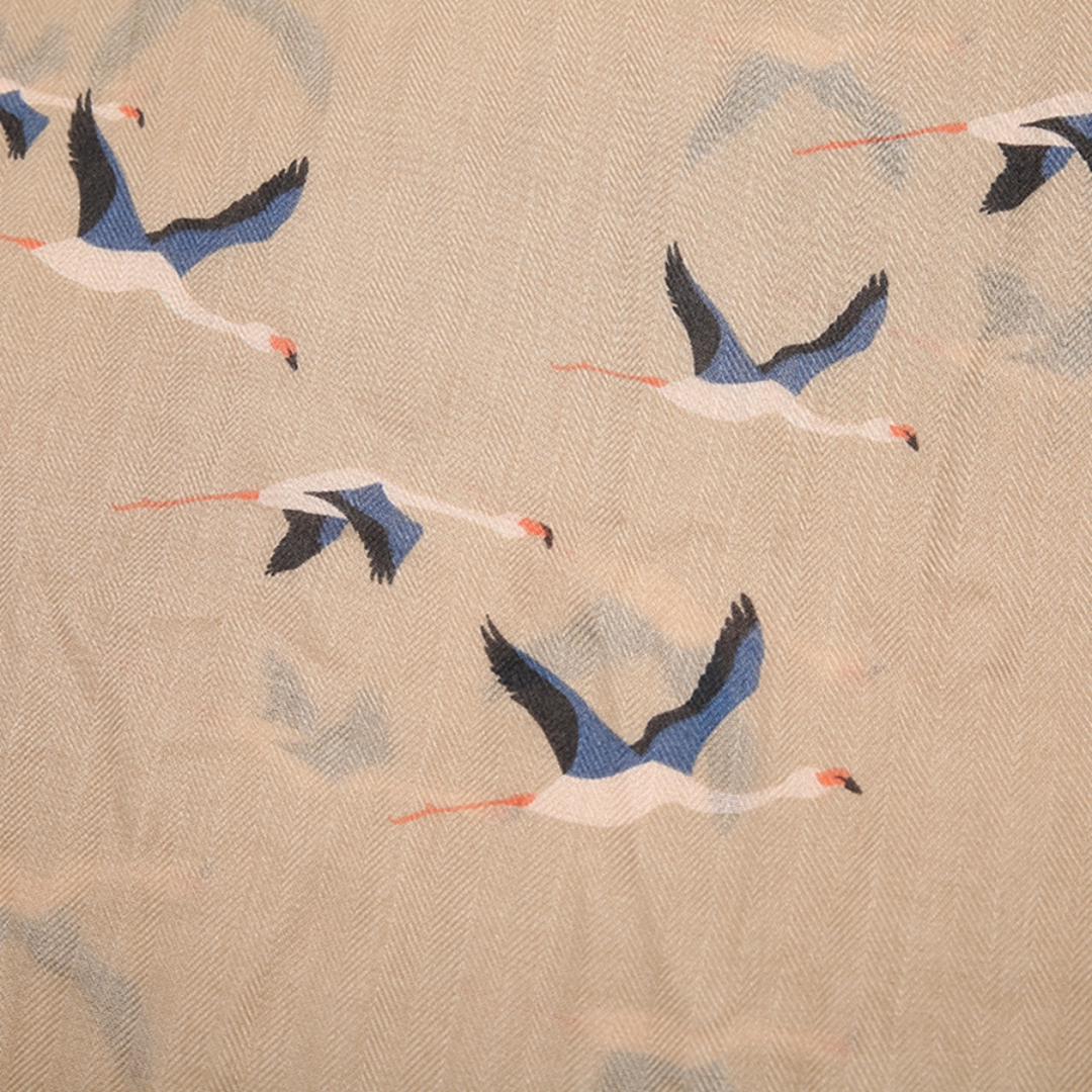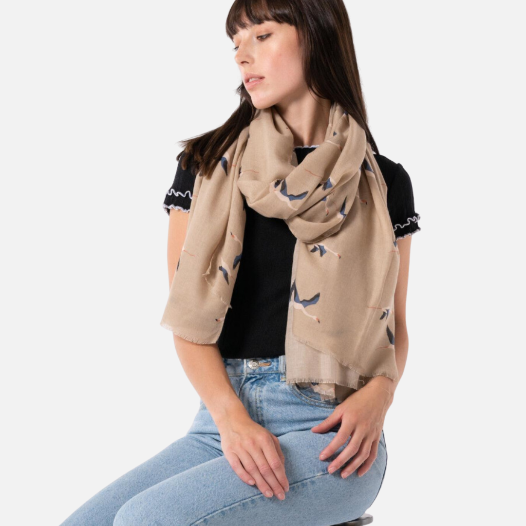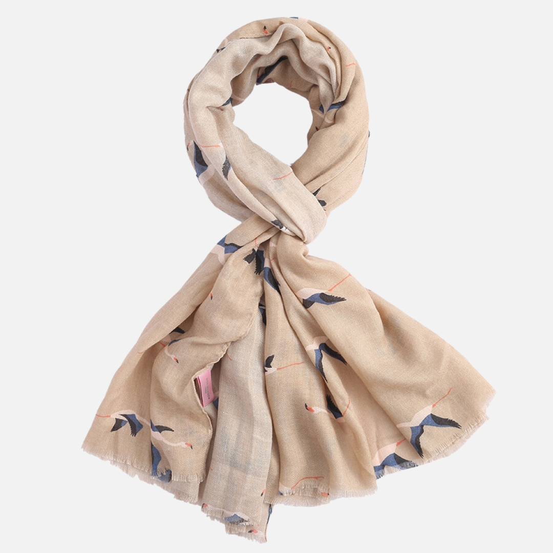 Rev up your wardrobe with this silky-soft scarf in mushroom from Miss Sparrow. The irregular design of flying Flamingos adds a pop of colour and elevates any smart or casual outfit. Spice up your look by pairing it with a knitted jumper or use it to make a statement when dressing to impress!