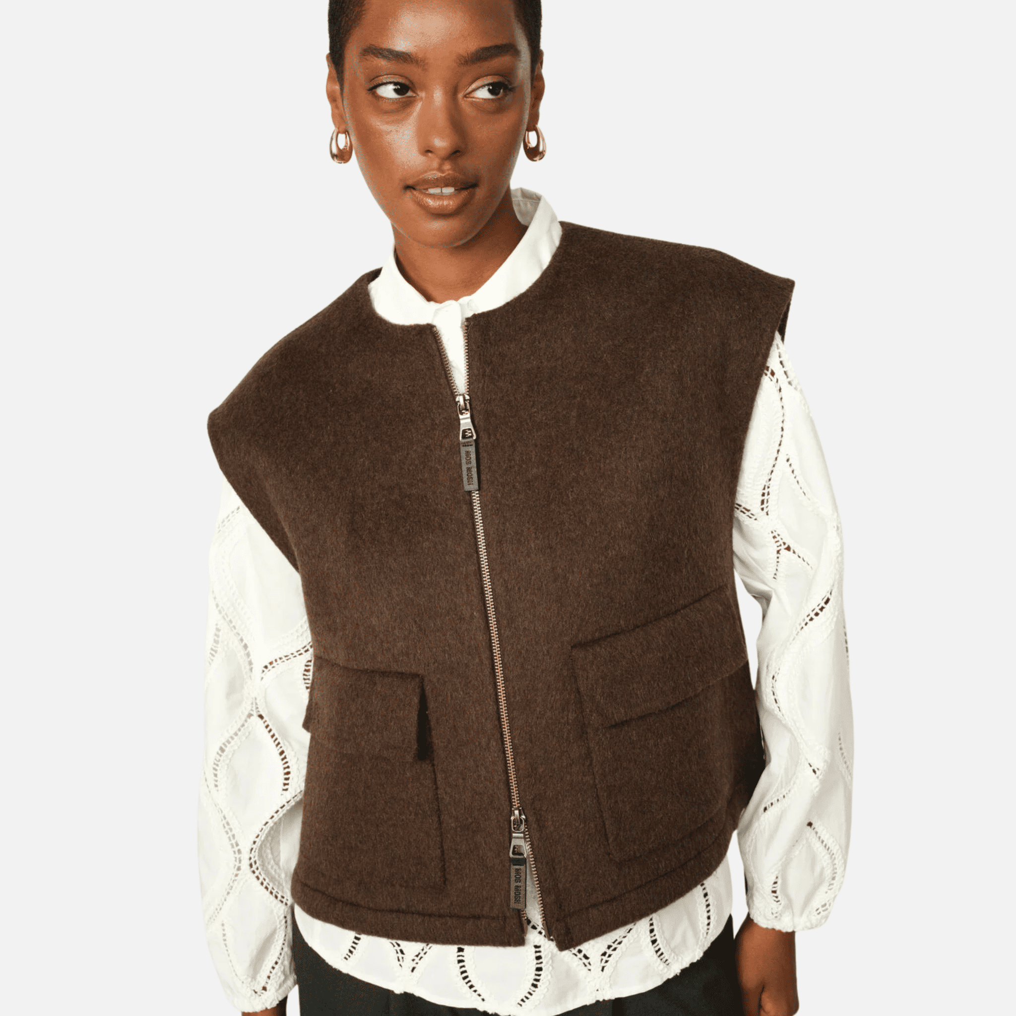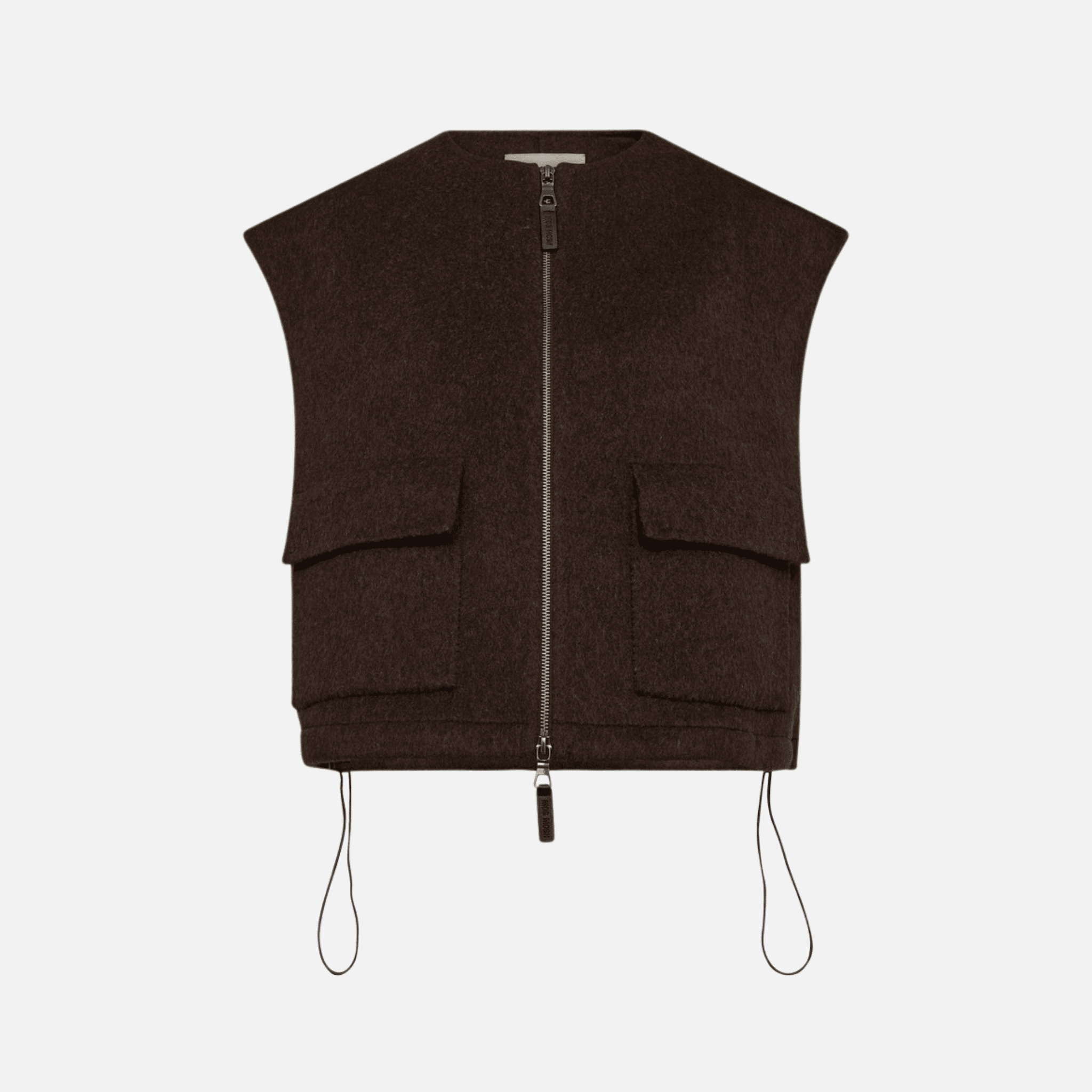 The Elise Loisa Wool Vest by Mos Mosh is a chic layering essential crafted in a rich mélange wool blend. Designed with a zip closure, adjustable drawstring hem, and practical flap pockets, it combines warmth with a modern, functional edge. Perfect for layering over knits or under coats when the temperature drops.