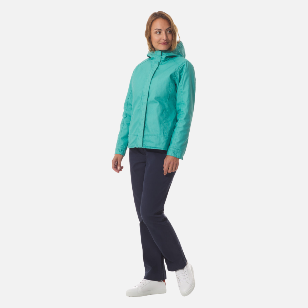 The Fionawax in colour Celadon by Mousqueton is a practical and stylish cotton jacket featuring a hood lined in fleece fur for extra warmth and comfort. It has a concealed zip under the front tab with hidden press stud fastenings under collar tab and branded snaps on the cuffs. It also has one inside pocket and two front pockets with topstitching featured in the outlines of the pockets. The Fionawax is a great showerproof and cozy jacket making it the perfect wardrobe staple.