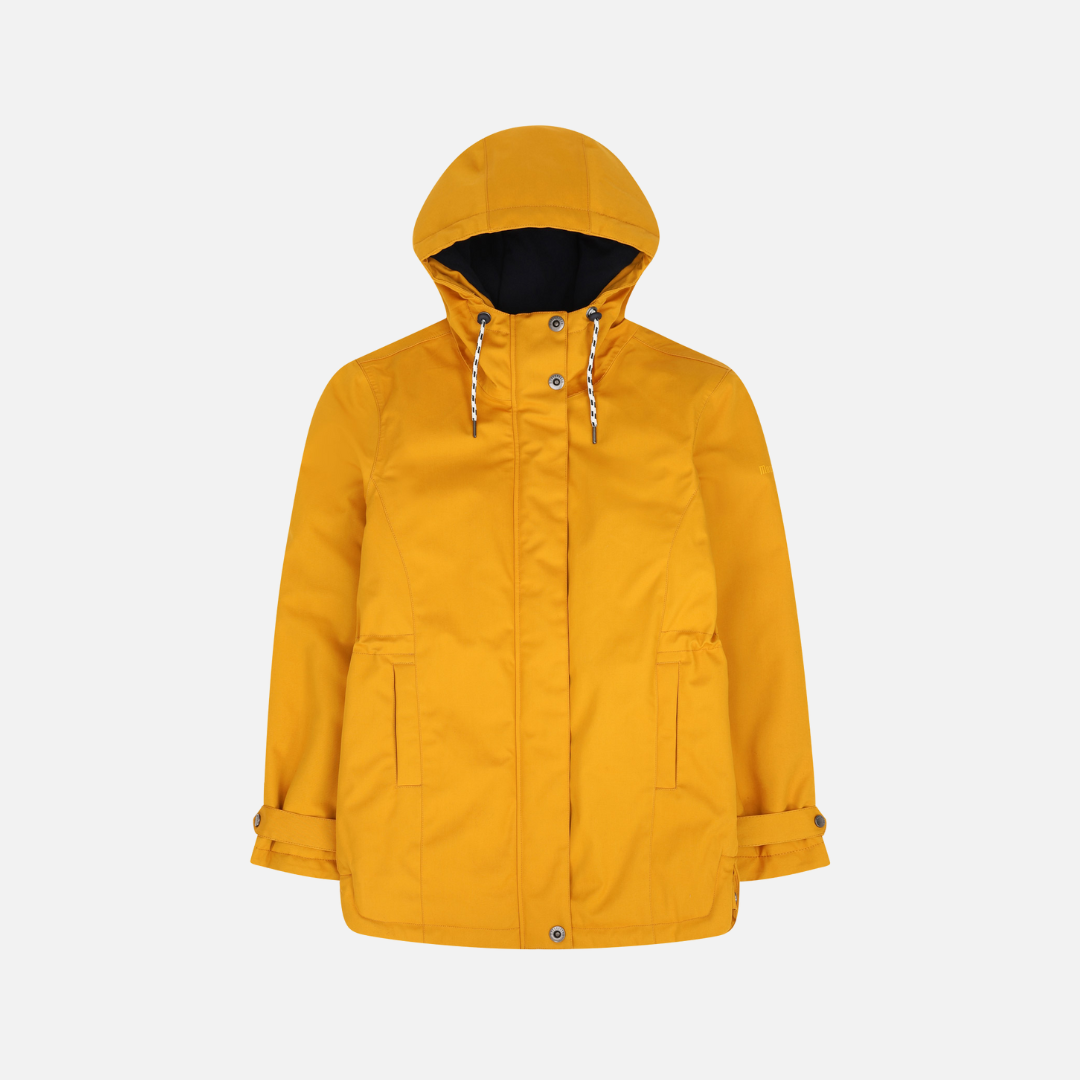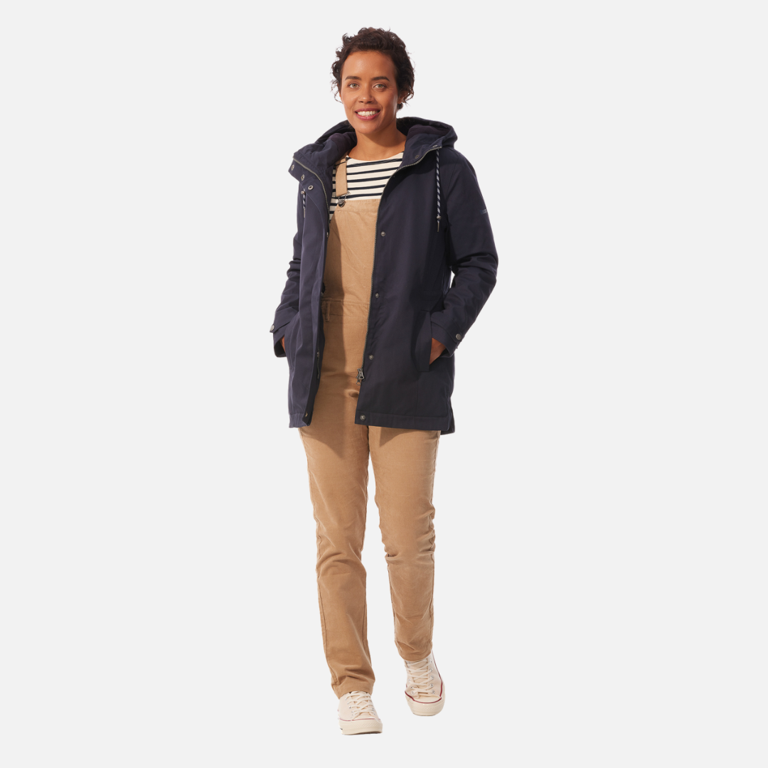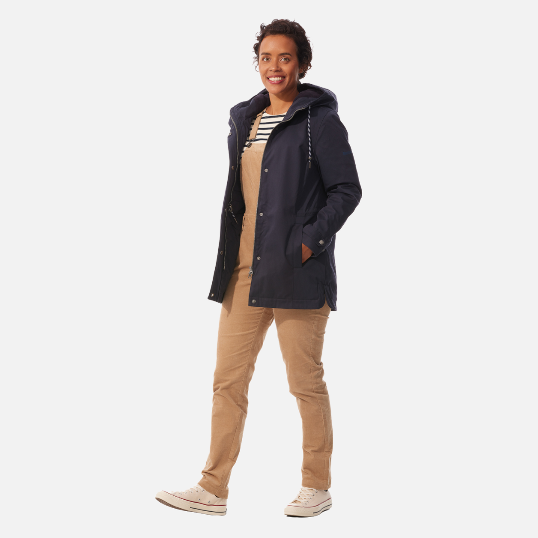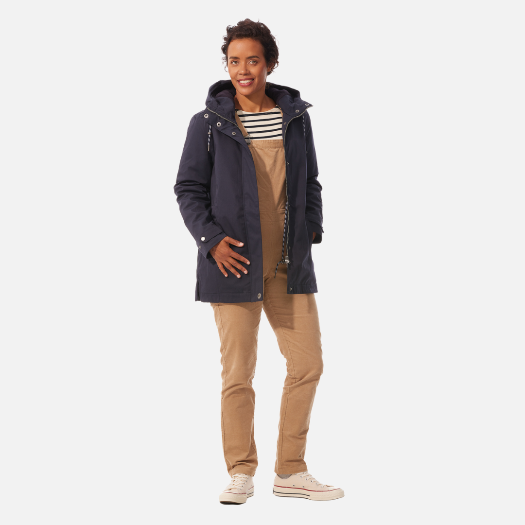 The Ponant in Marine (Navy) is a waterproof-breathable parka, waterproof seams, plain quilted medium lining in polycotton with printed stripe and mid-back seam. It features front princess cuts, back waist slider, piped pockets with snap fasteners, imitation metal zip under front tab with engraved or hidden hollow metal snaps, lined fleece hood with eyelets, bi-colour drawstring with tone-in rubber stoppers, cuffs tightened, print left sleeve.
