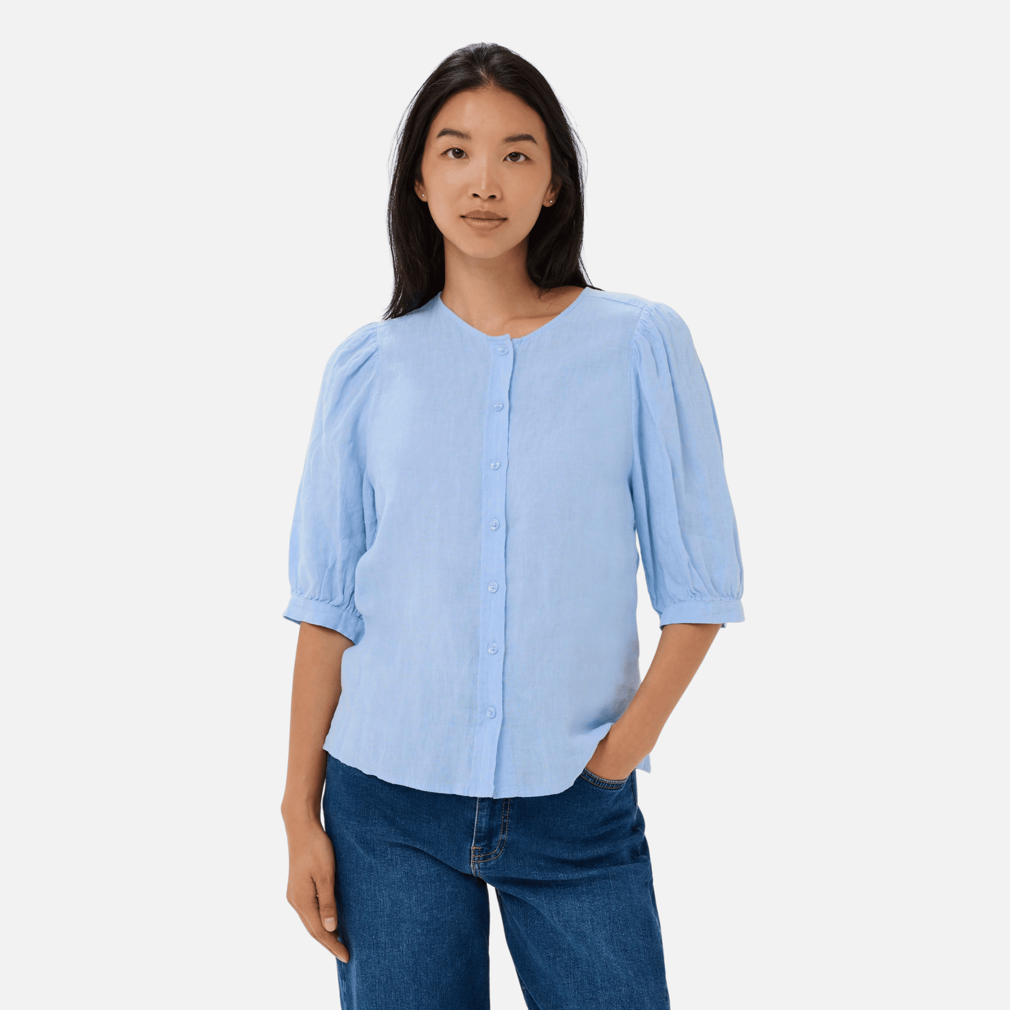 Effortlessly refined, the Azra Blouse in Serenity by Part Two is crafted from pure linen for a naturally breathable, lightweight feel. The softly voluminous elbow-length sleeves create gentle shape, while the round neckline and button fastening keep the silhouette clean and understated.