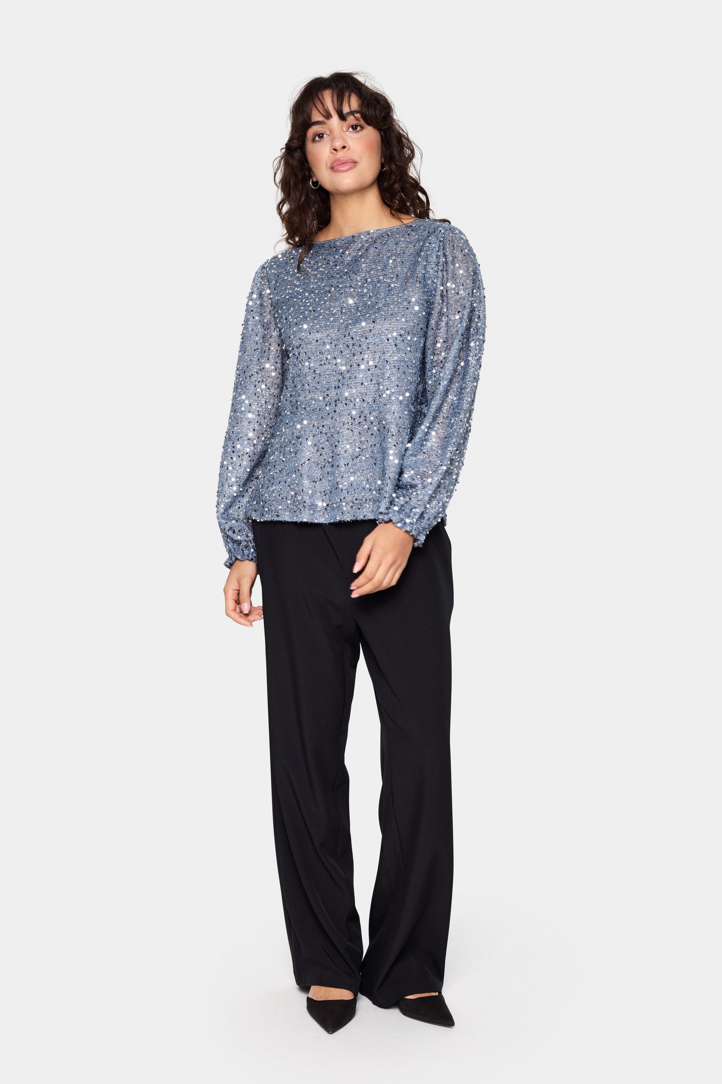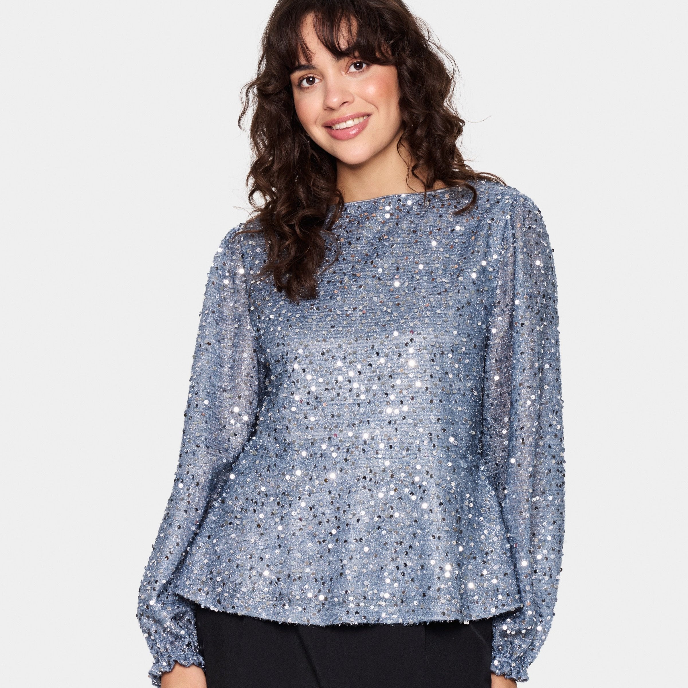 Experience the ultimate addition to your wardrobe with the Hinna Sequin Blouse from Saint Tropez. Dazzling sequins adorn this blouse, featuring a flattering slash neckline and long sleeves. Elevate your style for any social event, whether it be a glamorous night out or a casual lunch with friends.