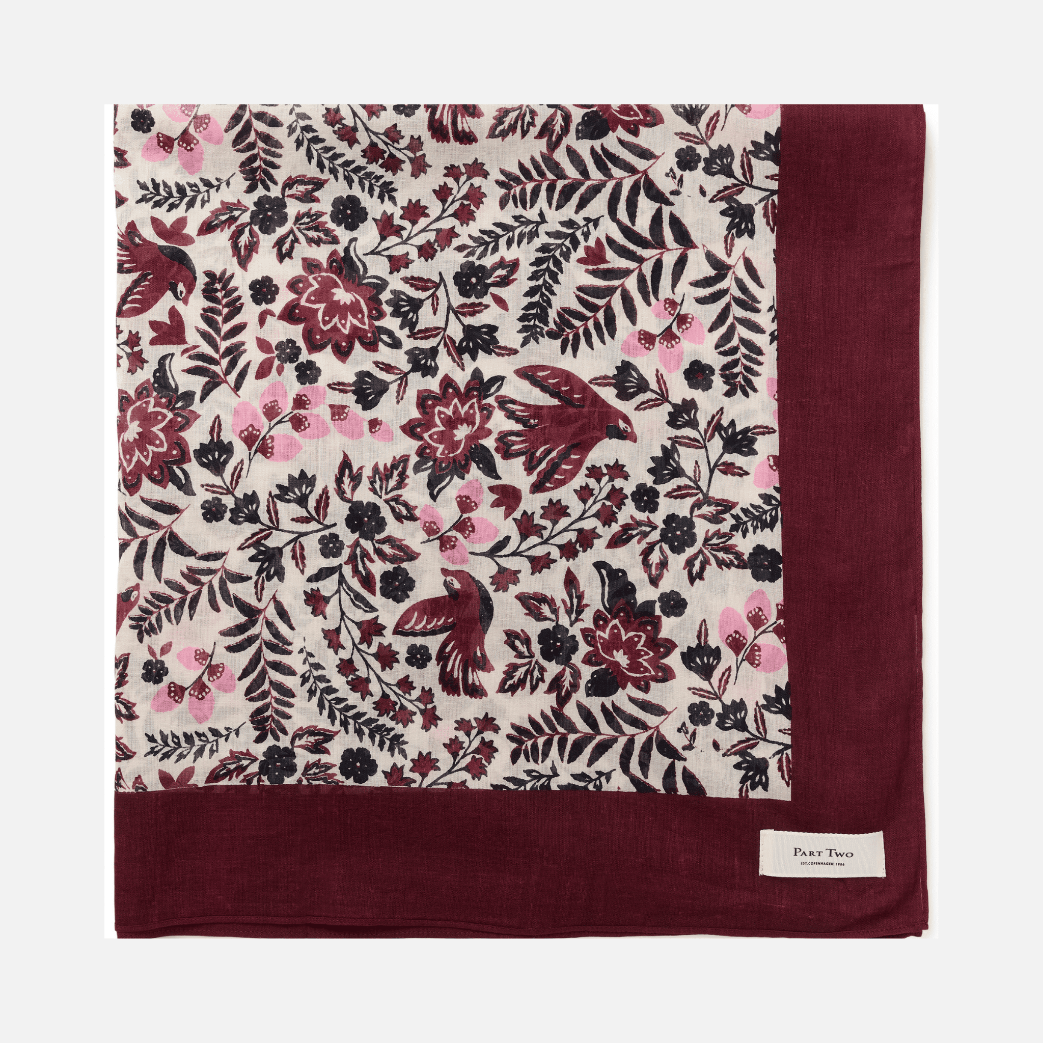 A beautifully detailed finishing touch, the Phi Scarf in Fig Bird Print by Part Two brings soft colour and delicate pattern to everyday dressing. Featuring an elegant bird and floral motif in off-white tones against a rich fig background, it adds effortless charm whether worn casually or styled with intention.