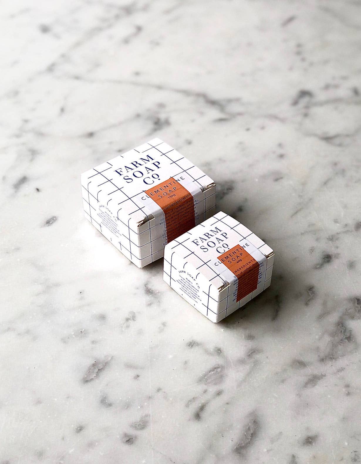 Farm Soap Co. soaps are gentle, vegan, natural and made from botanical ingredients. Fragrances are delicate and contain no synthetic chemicals. These soaps are suitable for washing both skin and hair, and because they contain natural oils and butters, they are moisturising and conditioning. Citrus nobilis, the clementine, is a tangor, or hybrid between a sweet orange and a mandarin. Refreshing and sweet, its essential oil is filled with antioxidants that fight free radicals, help reduce fine lines and wrinkles and promote the skin’s healing ability. Available in two sizes: approximately 110 grams and 40 grams. All soaps are handmade and cured weights are approximate.